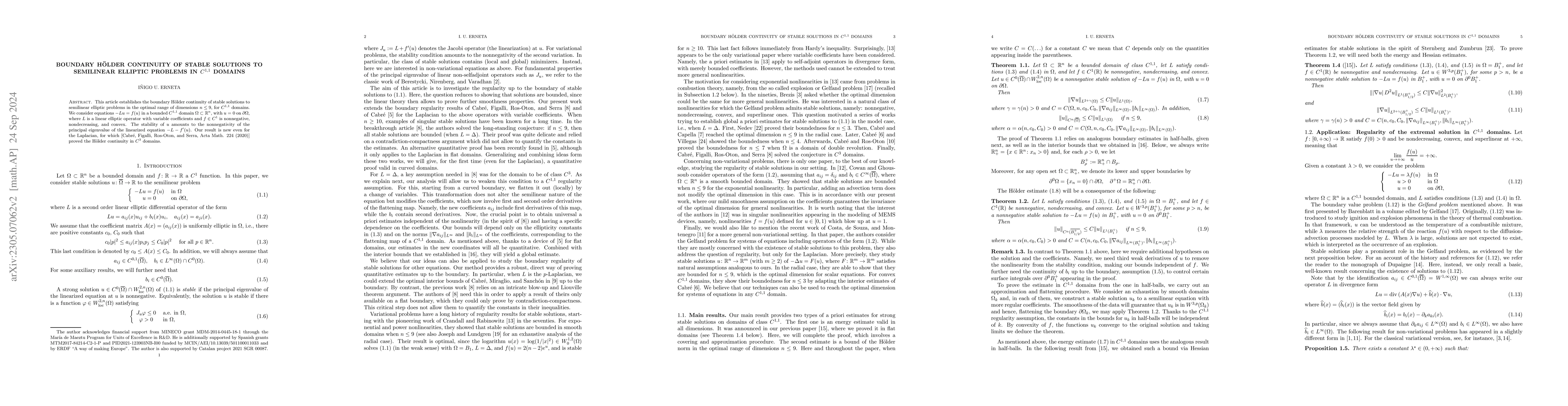 This article establishes the boundary H\"{o}lder continuity of stable solutions to semilinear elliptic problems in the optimal range of dimensions $n \leq 9$, for $C^{1,1}$ domains. We consider equations $- L u = f(u)$ in a bounded $C^{1,1}$ domain $\Omega \subset \mathbb{R}^n$, with $u = 0$ on $\partial \Omega$, where $L$ is a linear elliptic operator with variable coefficients and $f \in C^1$ is nonnegative, nondecreasing, and convex. The stability of $u$ amounts to the nonnegativity of the principal eigenvalue of the linearized equation $- L - f'(u)$. Our result is new even for the Laplacian, for which [Cabr\'{e}, Figalli, Ros-Oton, and Serra, Acta Math. 224 (2020)] proved the H\"{o}lder continuity in $C^3$ domains.