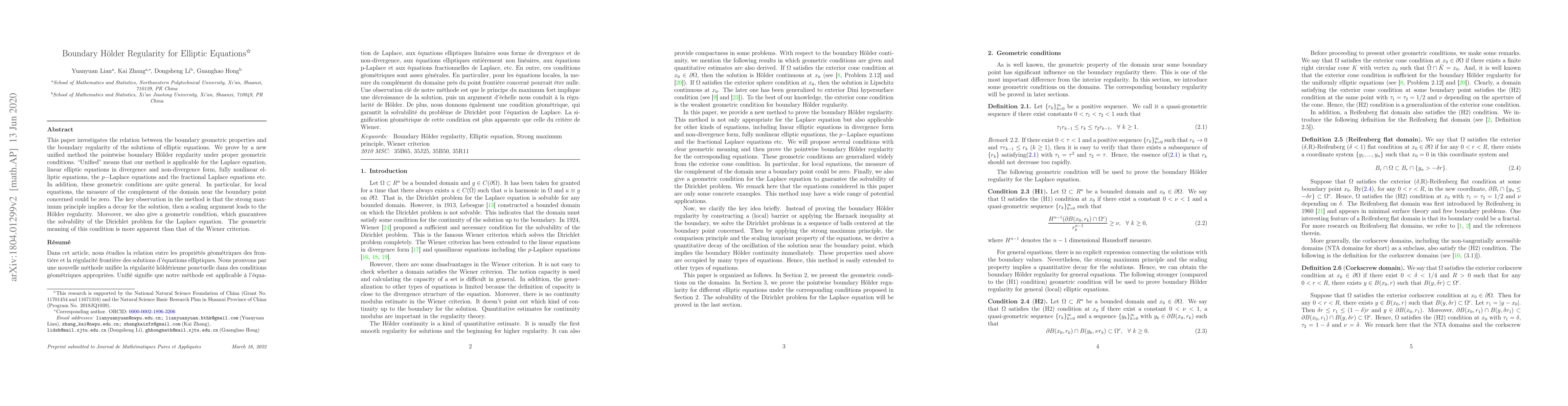 This paper investigates the relation between the boundary geometric properties and the boundary regularity of the solutions of elliptic equations. We prove by a new unified method the pointwise boundary H\"{o}lder regularity under proper geometric conditions. "Unified" means that our method is applicable for the Laplace equation, linear elliptic equations in divergence and non-divergence form, fully nonlinear elliptic equations, the $p-$Laplace equations and the fractional Laplace equations etc. In addition, these geometric conditions are quite general. In particular, for local equations, the measure of the complement of the domain near the boundary point concerned could be zero. The key observation in the method is that the strong maximum principle implies a decay for the solution, then a scaling argument leads to the H\"{o}lder regularity. Moreover, we also give a geometric condition, which guarantees the solvability of the Dirichlet problem for the Laplace equation. The geometric meaning of this condition is more apparent than that of the Wiener criterion.