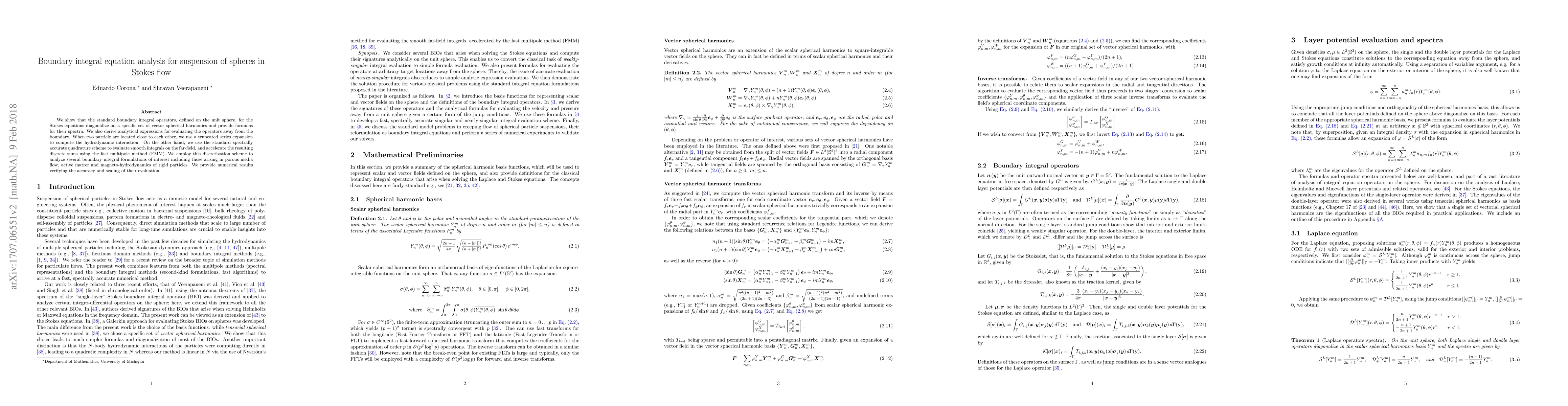 This paper analyzes boundary integral equations for suspensions of spheres in Stokes flow, showing that the integral operators diagonalize on vector spherical harmonics and providing their spectra. It employs a truncated series for near-field interactions and spectrally accurate quadrature with the fast multipole method for far-field evaluations, demonstrating accuracy and efficiency across various boundary integral formulations.