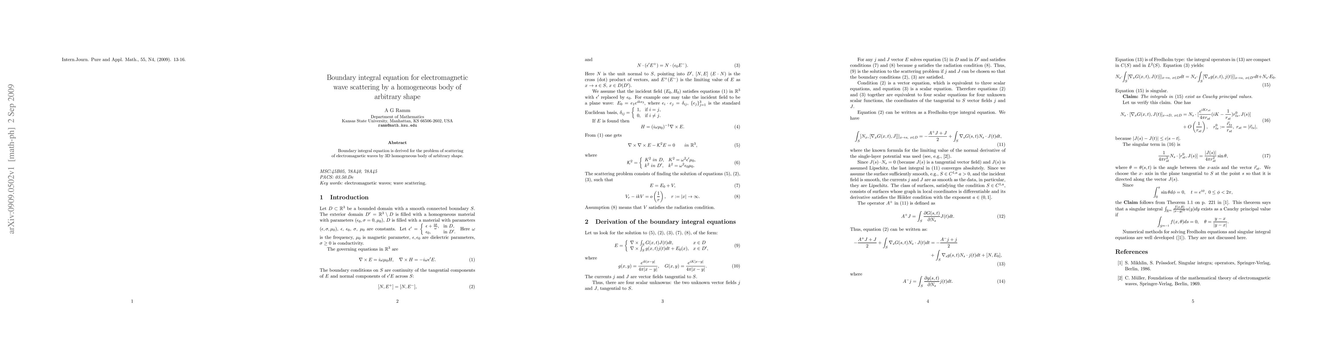 Summary: This paper derives a boundary integral equation to model electromagnetic wave scattering by a 3D homogeneous body with an arbitrary shape, providing a mathematical framework for analyzing such scattering problems.
