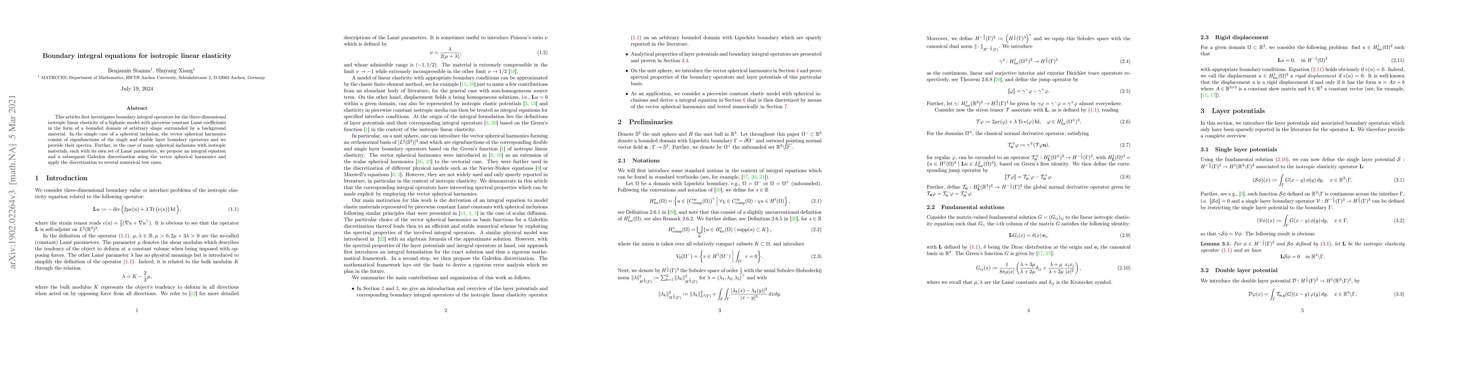 This articles first investigates boundary integral operators for the three-dimensional isotropic linear elasticity of a biphasic model with piecewise constant Lam\'e coefficients in the form of a bounded domain of arbitrary shape surrounded by a background material. In the simple case of a spherical inclusion, the vector spherical harmonics consist of eigenfunctions of the single and double layer boundary operators and we provide their spectra. Further, in the case of many spherical inclusions with isotropic materials, each with its own set of Lam\'e parameters, we propose an integral equation and a subsequent Galerkin discretization using the vector spherical harmonics and apply the discretization to several numerical test cases.