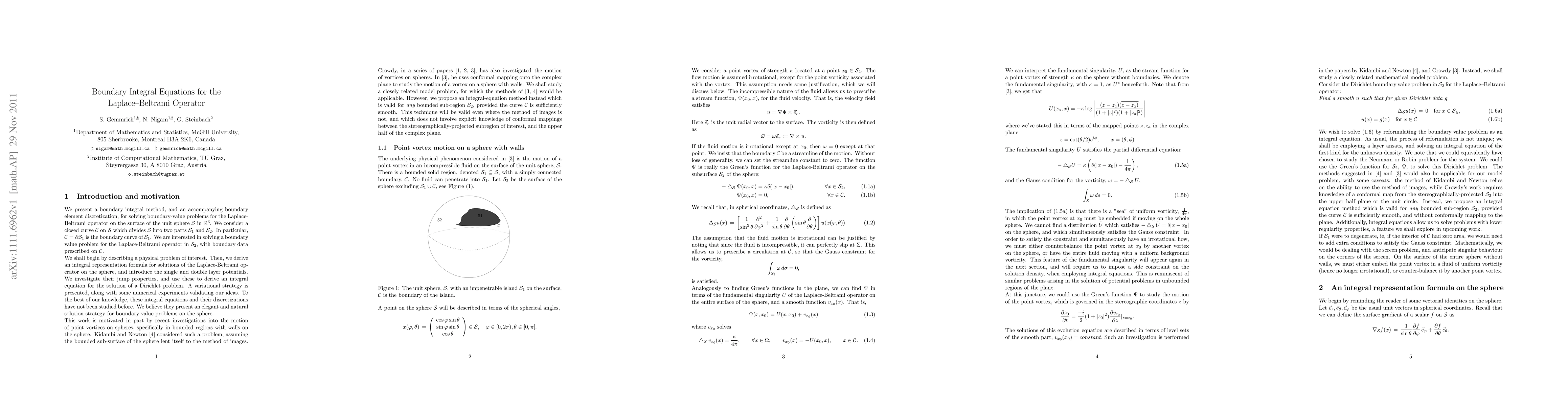 We present a boundary integral method, and an accompanying boundary element discretization, for solving boundary-value problems for the Laplace-Beltrami operator on the surface of the unit sphere $\S$ in $\mathbb{R}^3$. We consider a closed curve ${\cal C}$ on ${\cal S}$ which divides ${\cal S}$ into two parts ${\cal S}_1$ and ${\cal S}_2$. In particular, ${\cal C} = \partial {\cal S}_1$ is the boundary curve of ${\cal S}_1$. We are interested in solving a boundary value problem for the Laplace-Beltrami operator in $\S_2$, with boundary data prescribed on $\C$.