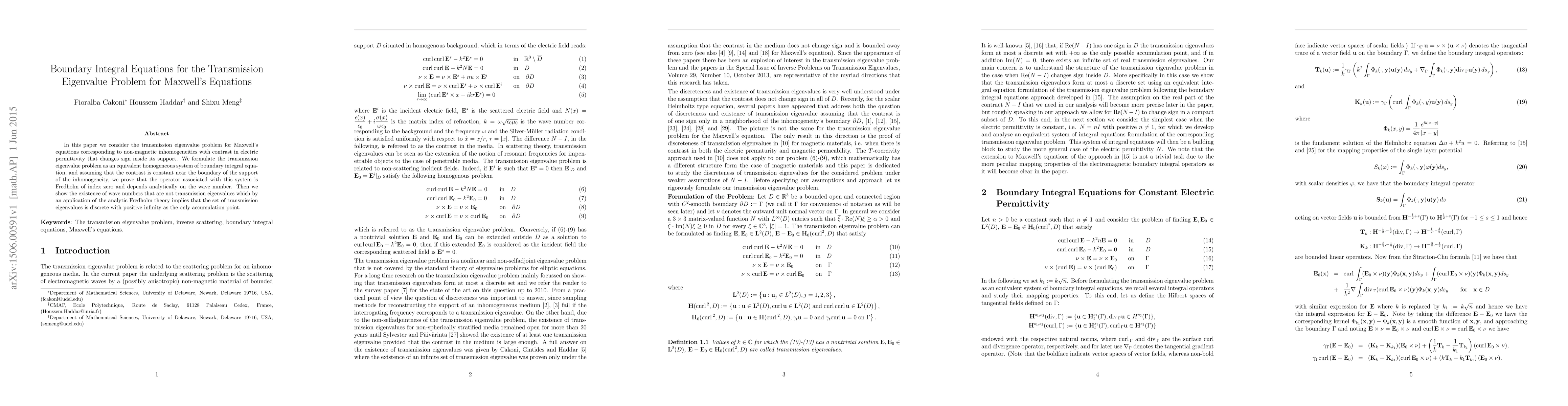 The research formulates the transmission eigenvalue problem for Maxwell's equations as an equivalent homogeneous system of boundary integral equations for non-magnetic inhomogeneities with contrasting electric permittivity, proving the associated operator is Fredholm of index zero and analytically dependent on the wave number.