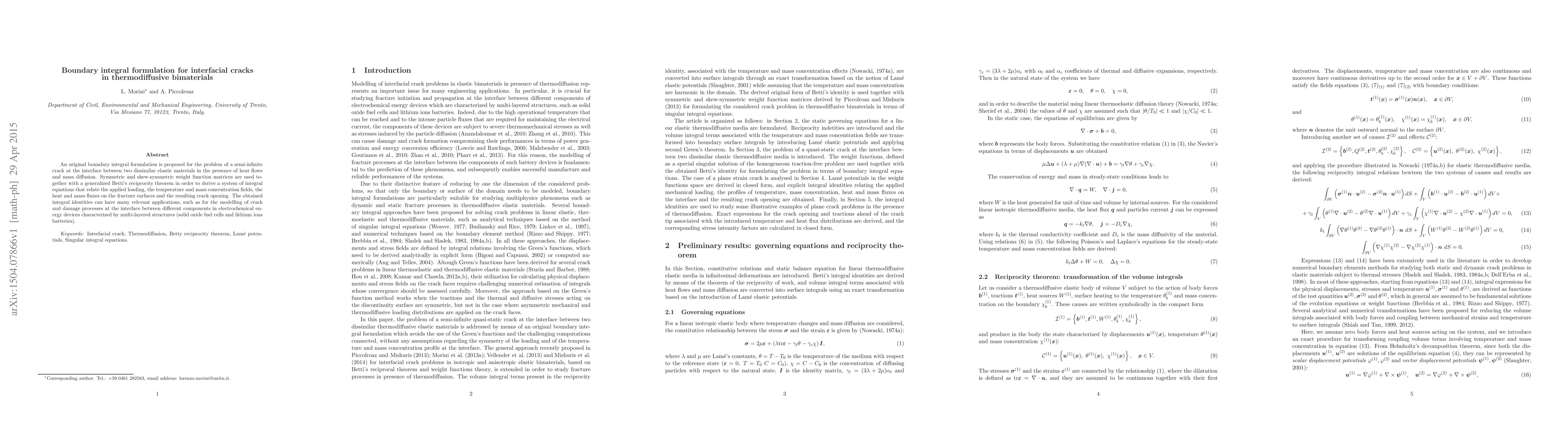 An original boundary integral formulation is proposed for the problem of a semi-infinite crack at the interface between two dissimilar elastic materials in the presence of heat flows and mass diffusion. Symmetric and skew-symmetric weight function matrices are used together with a generalized Betti's reciprocity theorem in order to derive a system of integral equations that relate the applied loading, the temperature and mass concentration fields, the heat and mass fluxes on the fracture surfaces and the resulting crack opening. The obtained integral identities can have many relevant applications, such as for the modelling of crack and damage processes at the interface between different components in electrochemical energy devices characterized by multi-layered structures (solid oxide fuel cells and lithium ions batteries).
