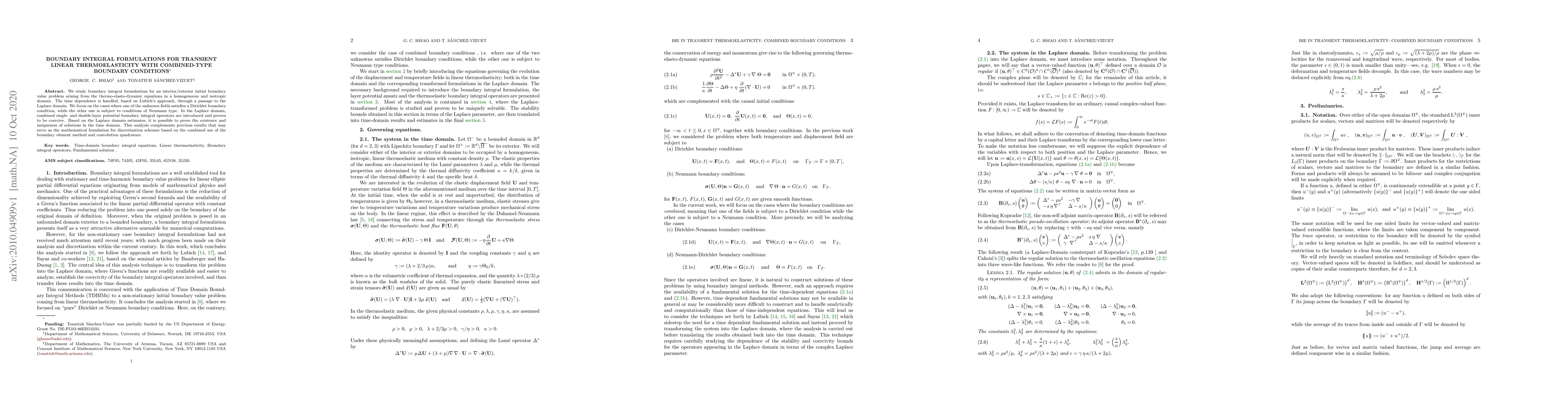 This paper develops boundary integral formulations for transient linear thermoelasticity with combined-type boundary conditions, utilizing Lubich's approach in the Laplace domain. It introduces coercive single- and double-layer potential operators to prove the existence and uniqueness of solutions, providing a foundation for boundary element method discretizations.
