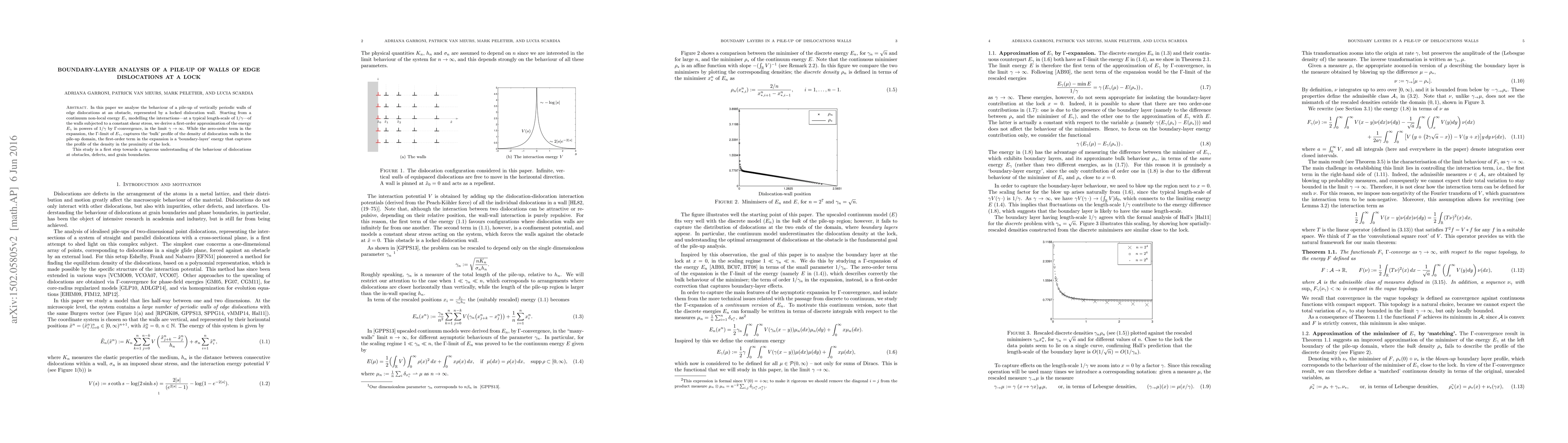 This paper derives a mathematical model using $Gamma$-convergence to analyze the behavior of a pile-up of edge dislocation walls at an obstacle, revealing a 'bulk' profile and a 'boundary-layer' energy. It's a foundational step in understanding dislocation interactions at defects and grain boundaries.
