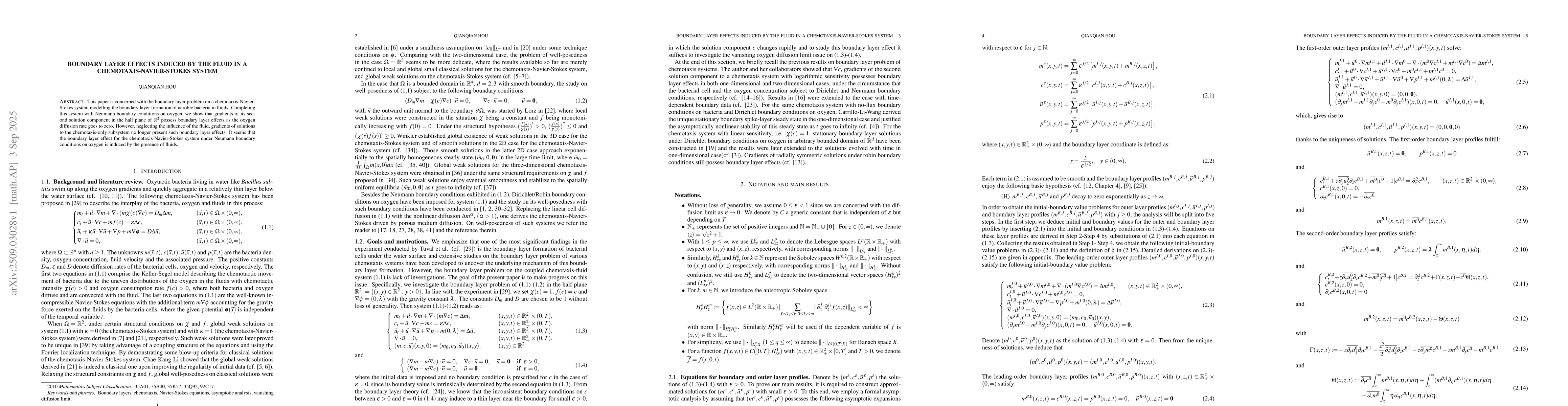 This paper is concerned with the boundary layer problem on a chemotaxis-Navier-Stokes system modelling the boundary layer formation of aerobic bacteria in fluids. Completing this system with Neumann boundary conditions on oxygen, we show that gradients of its second solution component in the half plane of $\mathbb{R}^2$ possess boundary layer effects as the oxygen diffusion rate goes to zero. However, neglecting the influence of the fluid, gradients of solutions to the chemotaxis-only subsystem no longer present such boundary layer effects. It seems that the boundary layer effect for the chemotaxis-Navier-Stokes system under Neumann boundary conditions on oxygen is induced by the presence of fluids.45