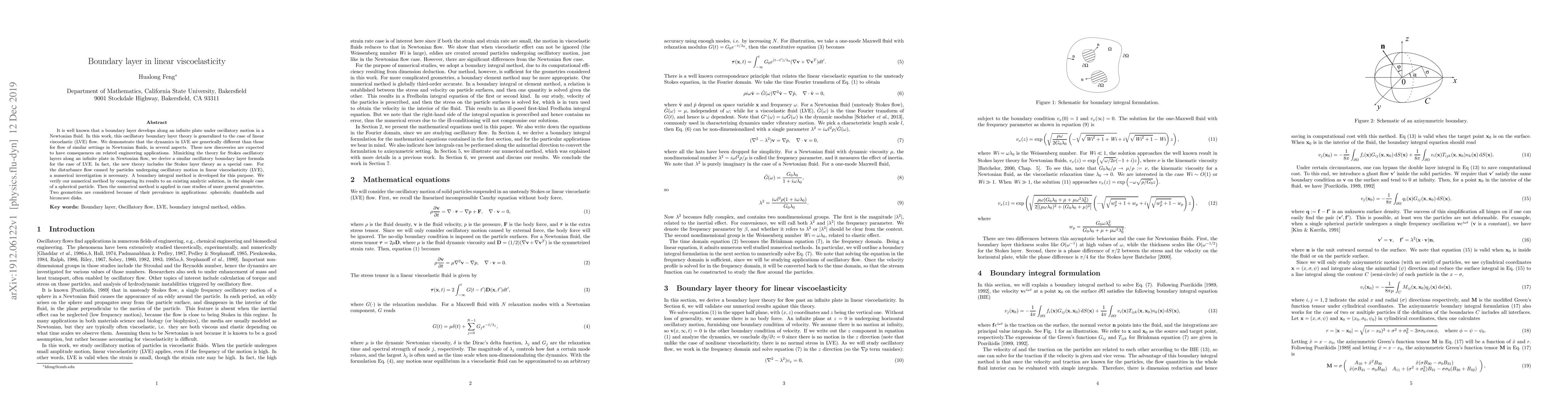 It is well known that a boundary layer develops along an infinite plate under oscillatory motion in a Newtonian fluid. In this work, this oscillatory boundary layer theory is generalized to the case of linear viscoelastic(LVE) flow. We demonstrate that the dynamics in LVE are generically different than those for flow of similar settings in Newtonian fluids, in several aspects. These new discoveries are expected to have consequences on related engineering applications. Mimicking the theory for Stokes oscillatory layers along an infinite plate in Newtonian flow, we derive a similar oscillatory boundary layer formula for the case of LVE. In fact, the new theory includes the Stokes layer theory as a special case. For the disturbance flow caused by particles undergoing oscillatory motion in linear viscoelasticity(LVE), a numerical investigation is necessary. A boundary integral method is developed for this purpose. We verify our numerical method by comparing its results to an existing analytic solution, in the simple case of a spherical particle. Then the numerical method is applied in case studies of more general geometries. Two geometries are considered because of their prevalence in applications: spheroids; dumbbells and biconcave disks.