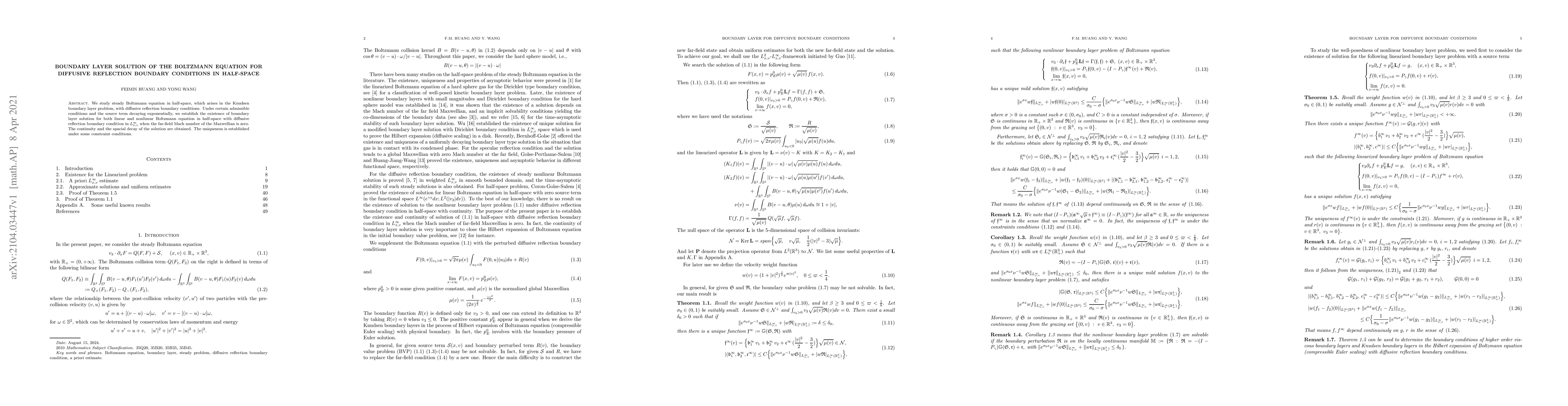 This paper establishes the existence and uniqueness of boundary layer solutions for the steady Boltzmann equation in half-space under diffusive reflection boundary conditions, proving continuity and spatial decay, and ensuring the solution's validity when the far-field Mach number is zero. Uniqueness is confirmed under specific constraint conditions.