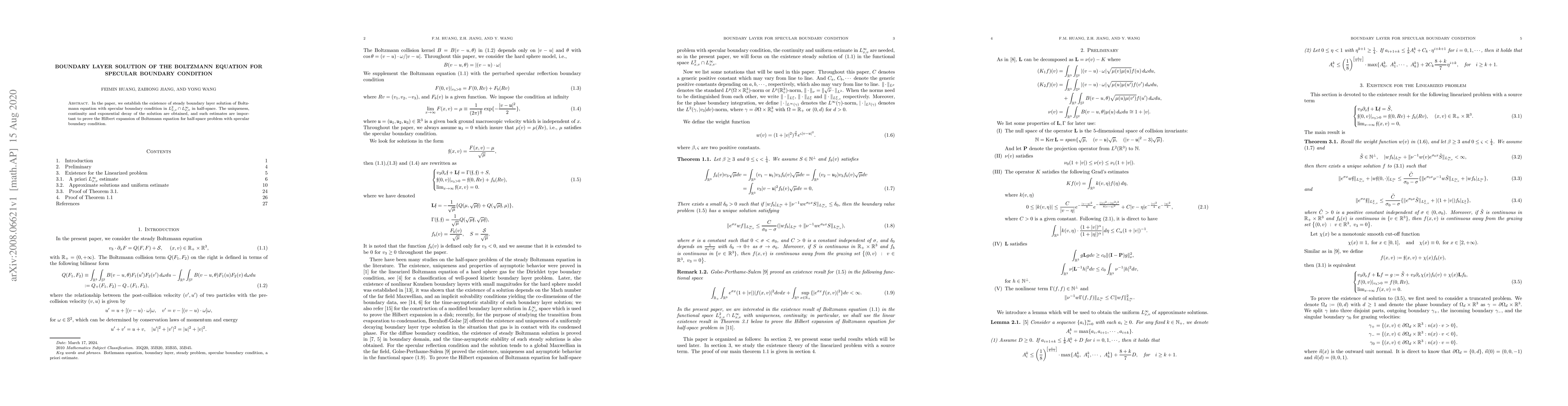 This paper establishes the existence of a steady boundary layer solution for the Boltzmann equation under a specular boundary condition, proving its uniqueness, continuity, and exponential decay in $L^2_{x,v}\cap L^\infty_{x,v}$ spaces, which is crucial for the Hilbert expansion of the Boltzmann equation in half-space scenarios.