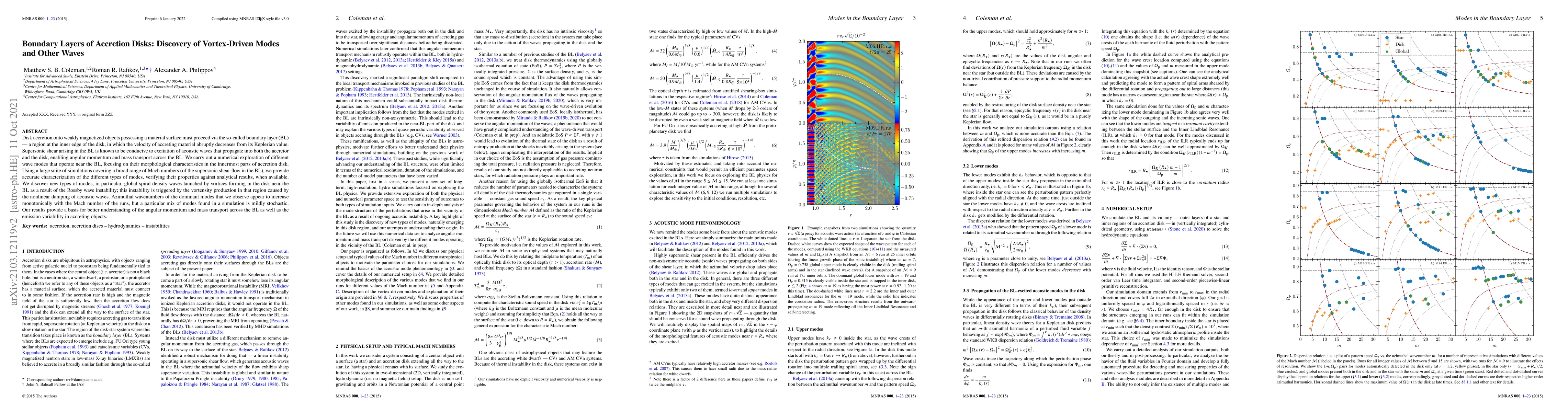 This paper explores the boundary layer of accretion disks, discovering new vortex-driven wave modes and other waves that transport angular momentum and mass. The study identifies global spiral density waves generated by vortices due to the Rossby wave instability, providing insights into emission variability in accreting objects.