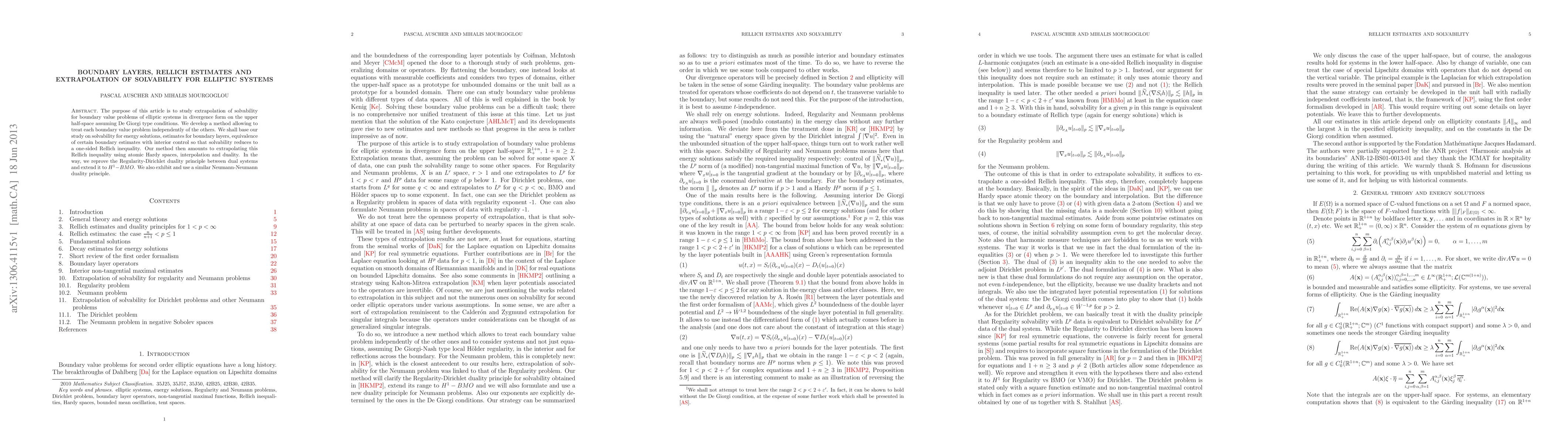The purpose of this article is to study extrapolation of solvability for boundary value problems of elliptic systems in divergence form on the upper half-space assuming De Giorgi type conditions. We develop a method allowing to treat each boundary value problem independently of the others. We shall base our study on solvability for energy solutions, estimates for boundary layers, equivalence of certain boundary estimates with interior control so that solvability reduces to a one-sided Rellich inequality. Our method then amounts to extrapolating this Rellich inequality using atomic Hardy spaces, interpolation and duality. In the way, we reprove the Regularity-Dirichlet duality principle between dual systems and extend it to $H^1-BMO$. We also exhibit and use a similar Neumann-Neumann duality principle.