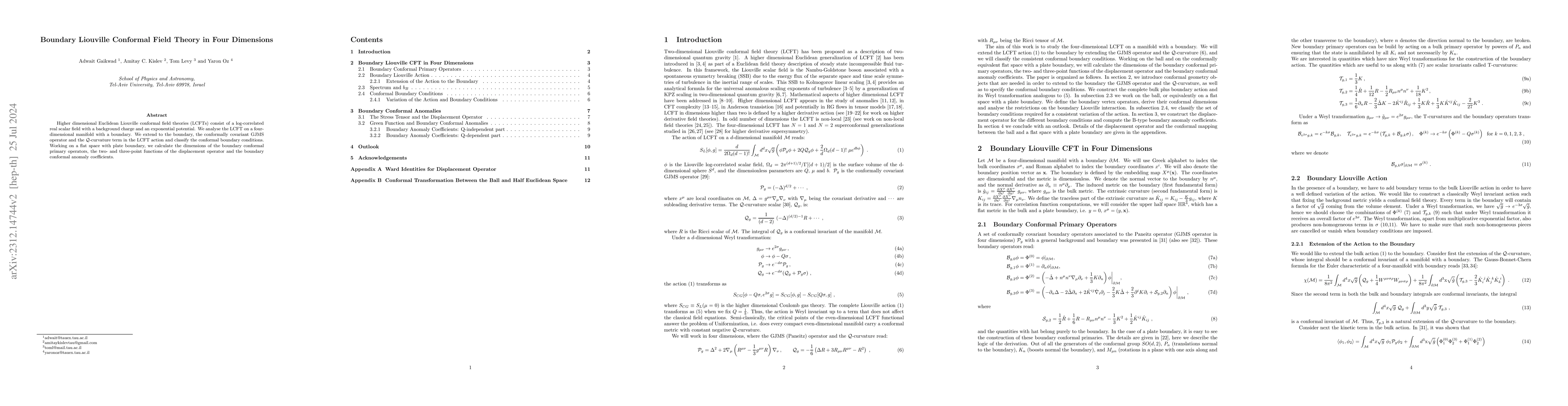 This paper studies four-dimensional Euclidean Liouville conformal field theories (LCFTs) on manifolds with boundaries, classifying conformal boundary conditions and calculating dimensions and functions of boundary conformal primary operators, including conformal anomalies.