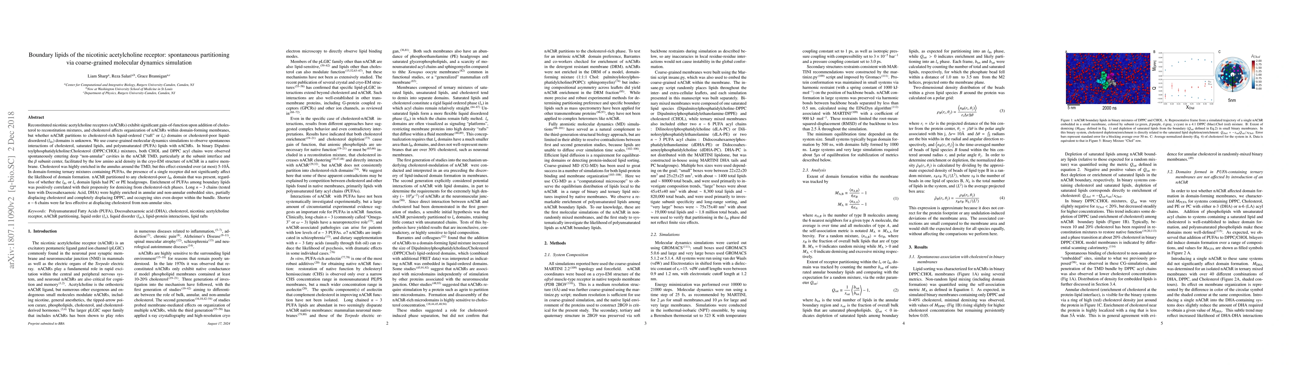 This study uses coarse-grained molecular dynamics simulations to investigate how nicotinic acetylcholine receptors (nAChRs) interact with cholesterol and various lipids. The findings show that cholesterol and saturated lipids preferentially partition into non-annular cavities of nAChRs, while nAChRs partition into cholesterol-poor domains, regardless of lipid headgroup type.
