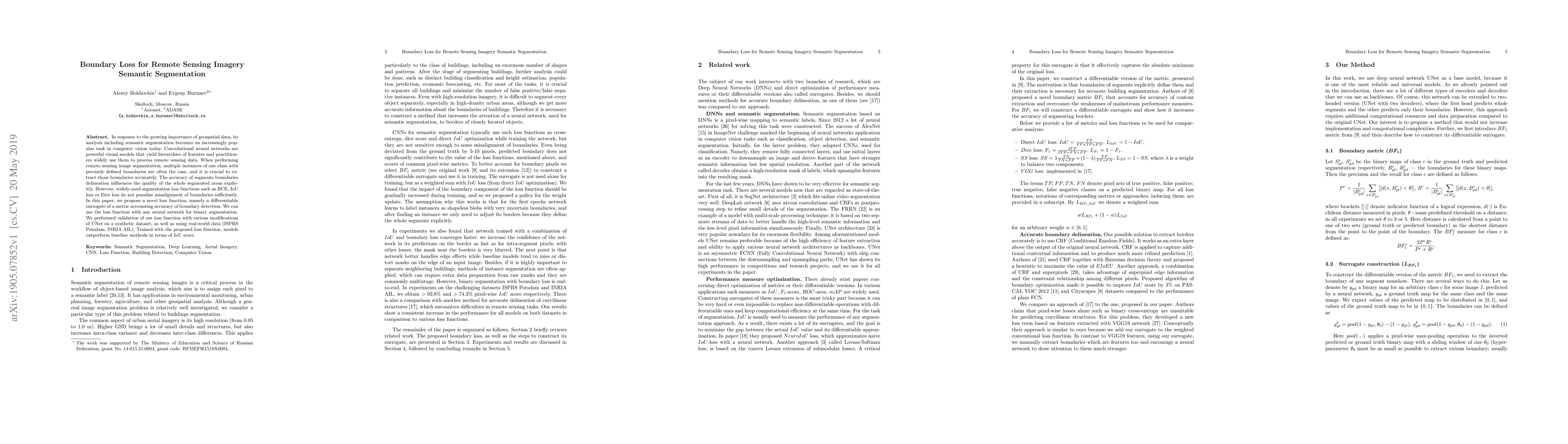 This paper proposes a novel boundary loss function for improving the accuracy of semantic segmentation in remote sensing imagery. The new loss function better penalizes boundary misalignment compared to existing methods, leading to improved segmentation performance, as demonstrated on both synthetic and real-world datasets.