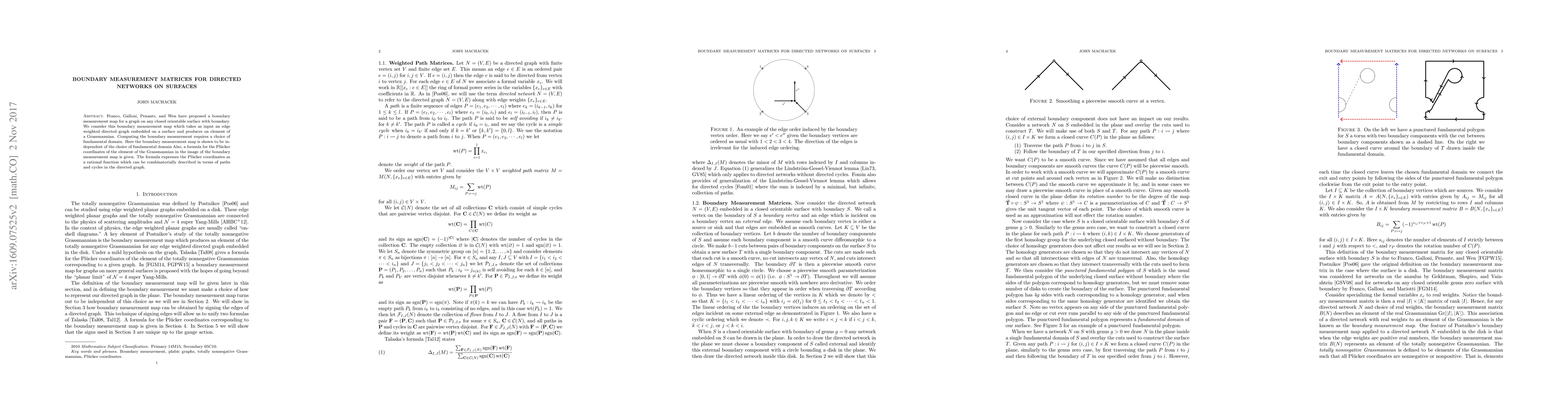 Franco, Galloni, Penante, and Wen have proposed a boundary measurement map for a graph on any closed orientable surface with boundary. We consider this boundary measurement map which takes as input an edge weighted directed graph embedded on a surface and produces on element of a Grassmannian. Computing the boundary measurement requires a choice of fundamental domain. Here the boundary measurement map is shown to be independent of the choice of fundamental domain Also, a formula for the Pl\"ucker coordinates of the element of Grassmannian in the image of the boundary measurement map is given. The formula expresses the Pl\"ucker coordinates as a rational function which can be combinatorially described in terms of paths and cycles in the directed graph.