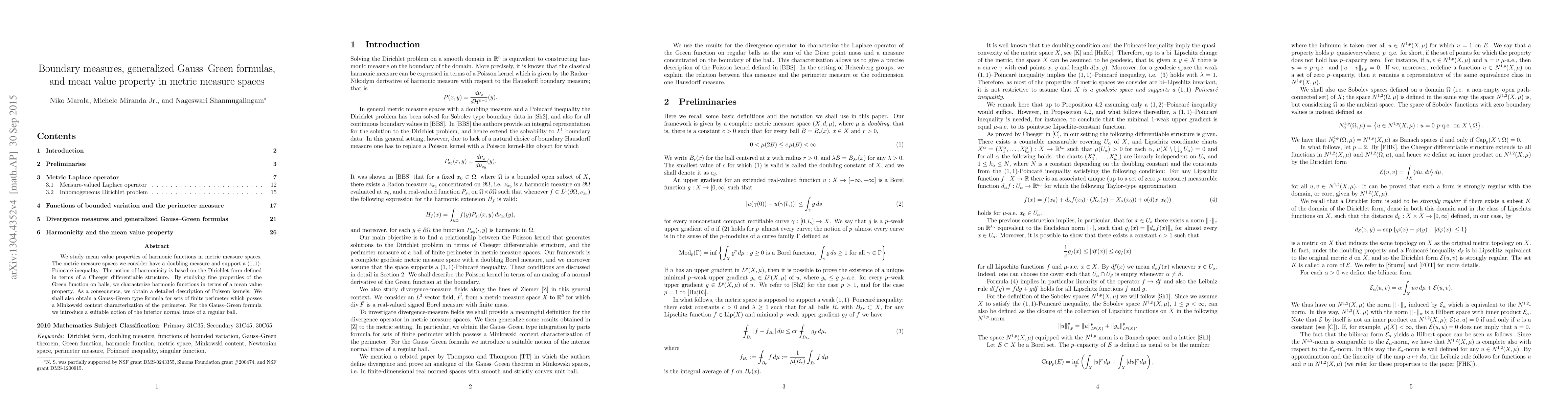 This paper explores mean value properties of harmonic functions in metric measure spaces with doubling measures and (1,1)-Poincaré inequalities. It characterizes harmonic functions using a mean value property and derives Gauss-Green formulas for sets of finite perimeter, introducing a concept of interior normal trace for regular balls.