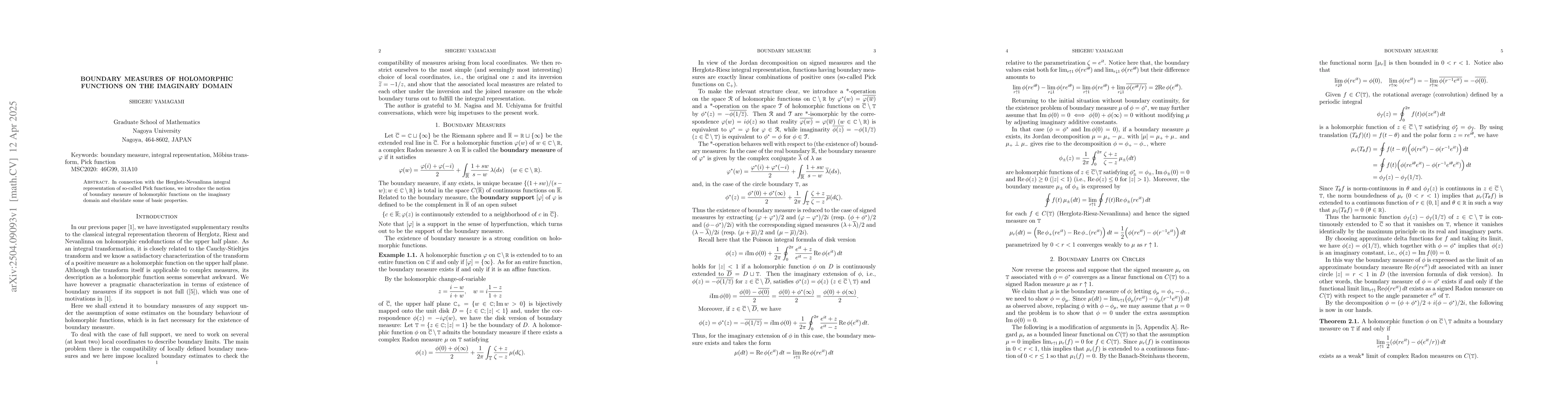 The paper presents a novel definition and properties of boundary measures for holomorphic functions on the imaginary domain, extending the Herglotz-Nevanlinna theory.
