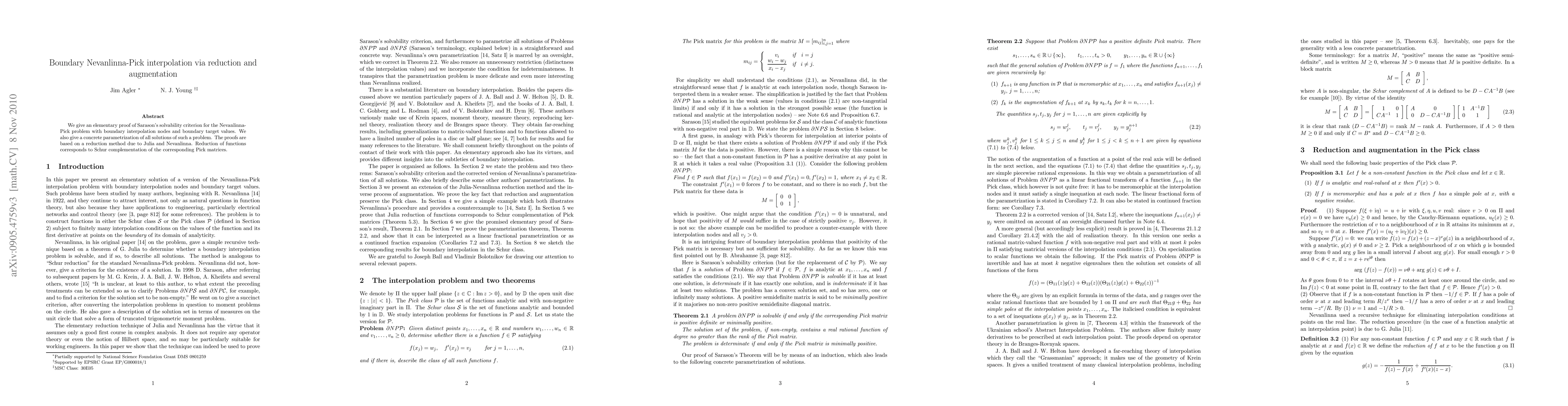 We give an elementary proof of Sarason's solvability criterion for the Nevanlinna-Pick problem with boundary interpolation nodes and boundary target values. We also give a concrete parametrization of all solutions of such a problem. The proofs are based on a reduction method due to Julia and Nevanlinna. Reduction of functions corresponds to Schur complementation of the corresponding Pick matrices.