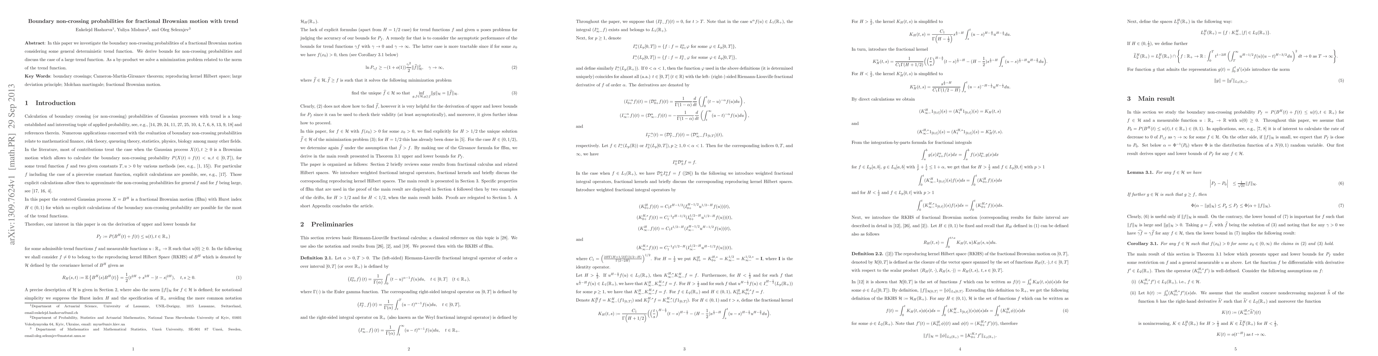 Summary: This paper examines the boundary non-crossing probabilities of fractional Brownian motion with a deterministic trend, deriving bounds for these probabilities and addressing the scenario of a large trend function. Additionally, it solves a related minimization problem concerning the norm of the trend function.