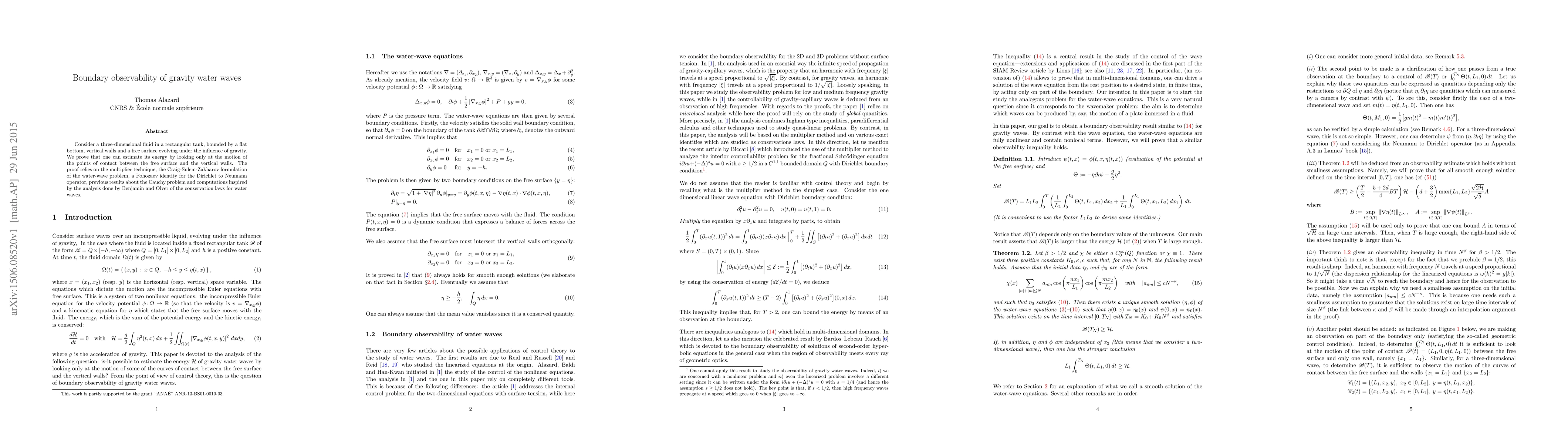 Consider a three-dimensional fluid in a rectangular tank, bounded by a flat bottom, vertical walls and a free surface evolving under the influence of gravity. We prove that one can estimate its energy by looking only at the motion of the points of contact between the free surface and the vertical walls. The proof relies on the multiplier technique, the Craig-Sulem-Zakharov formulation of the water-wave problem, a Pohozaev identity for the Dirichlet to Neumann operator, previous results about the Cauchy problem and computations inspired by the analysis done by Benjamin and Olver of the conservation laws for water waves.