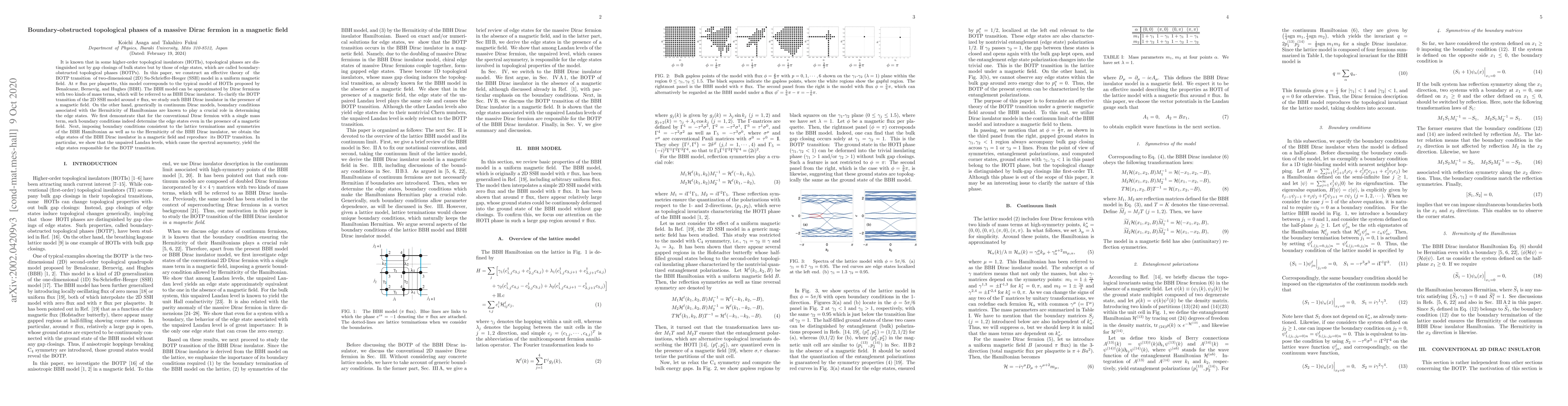 This paper constructs an effective theory for the boundary-obstructed topological phase transition in the 2D SSH model under a magnetic field, demonstrating that the transition is governed by the unpaired Landau levels causing spectral asymmetry. The study focuses on the BBH Dirac insulator, showing how boundary conditions consistent with the model's symmetries determine the edge states and reproduce the BOTP transition.