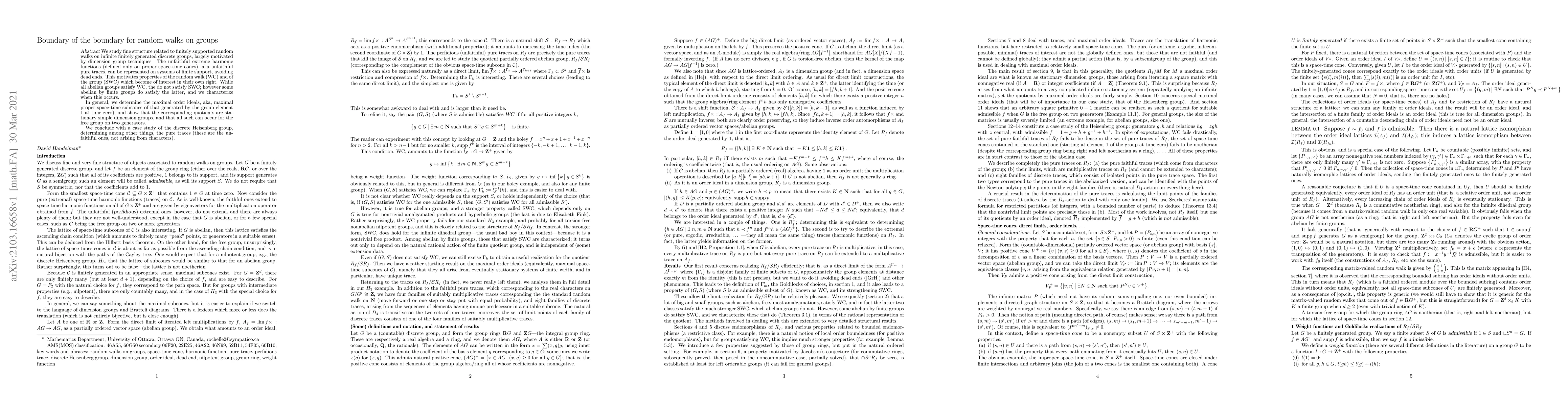 We study fine structure related to finitely supported random walks on infinite finitely generated discrete groups, largely motivated by dimension group techniques. The unfaithful extreme harmonic functions (defined only on proper space-time cones), aka unfaithful pure traces, can be represented on systems of finite support, avoiding dead ends. This motivates properties of the random walk (WC) and of the group (SWC) which become of interest in their own right. While all abelian groups satisfy WC, the do not satisfy SWC; however some abelian by finite groups do satisfy the latter, and we characterize when this occurs. In general, we determine the maximal order ideals, aka, maximal proper space-time subcones of that generated by the group element $1$ at time zero), and show that the corresponding quotients are stationary simple dimension groups, and that all such can occur for the free group on two generators. We conclude with a case study of the discrete Heisenberg group, determining among other things, the pure traces (these are the unfaithful ones, not arising from characters).