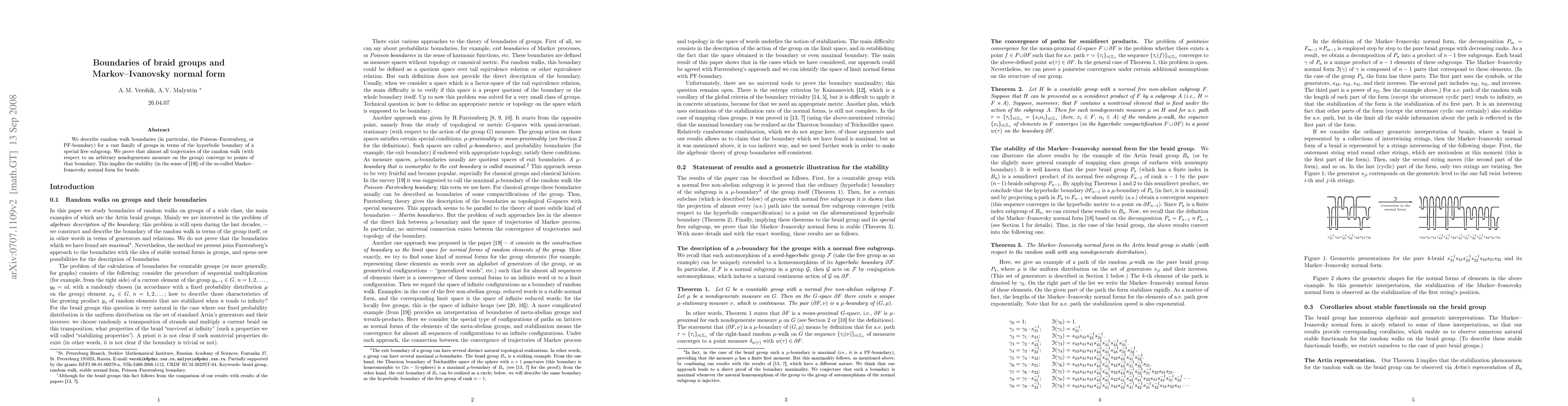 We describe random walk boundaries (in particular, the Poisson--Furstenberg, or PF-boundary) for a vast family of groups in terms of the hyperbolic boundary of a special free subgroup. We prove that almost all trajectories of the random walk (with respect to an arbitrary nondegenerate measure on the group) converge to points of that boundary. This implies the stability (in the sense of \cite{Ver}) of the so-called Markov--Ivanovsky normal form for braids.