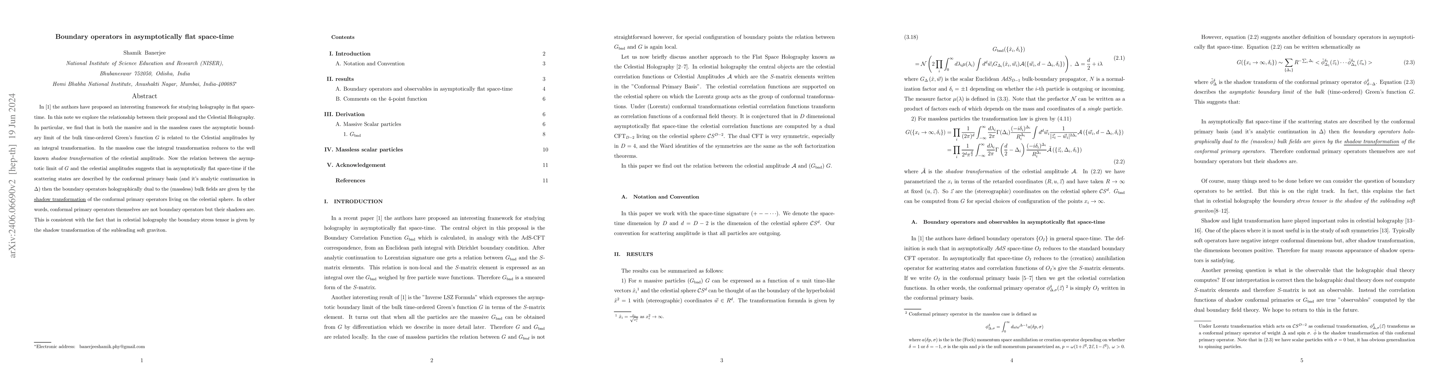 In arXiv:2311.03443 the authors have proposed an interesting framework for studying holography in flat space-time. In this note we explore the relationship between their proposal and the Celestial Holography. In particular, we find that in both the massive and in the massless cases the asymptotic boundary limit of the bulk time-ordered Green's function $G$ is related to the Celestial amplitudes by an integral transformation. In the massless case the integral transformation reduces to the well known \textit{shadow transformation} of the celestial amplitude. Now the relation between the asymptotic limit of $G$ and the celestial amplitudes suggests that in asymptotically flat space-time if the scattering states are described by the conformal primary basis (and it's analytic continuation in dimension $\Delta$) then the boundary operators holographically dual to the (massless) bulk fields are given by the \underline{shadow transformation} of the conformal primary operators living on the celestial sphere. In other words, conformal primary operators themselves are not boundary operators but their shadows are. This is consistent with the fact that in celestial holography the boundary stress tensor is given by the shadow transformation of the subleading soft graviton.