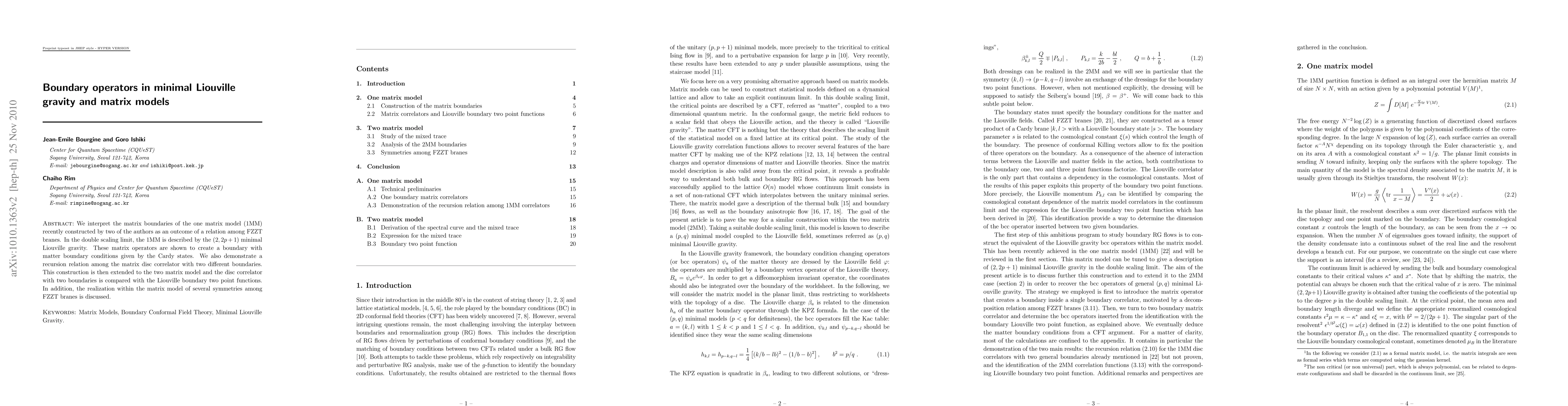 This paper interprets matrix boundaries in a one-matrix model as related to FZZT branes and shows they correspond to Cardy states in minimal Liouville gravity. It extends these findings to a two-matrix model and compares boundary correlators with Liouville two-point functions, while also discussing symmetries among FZZT branes.