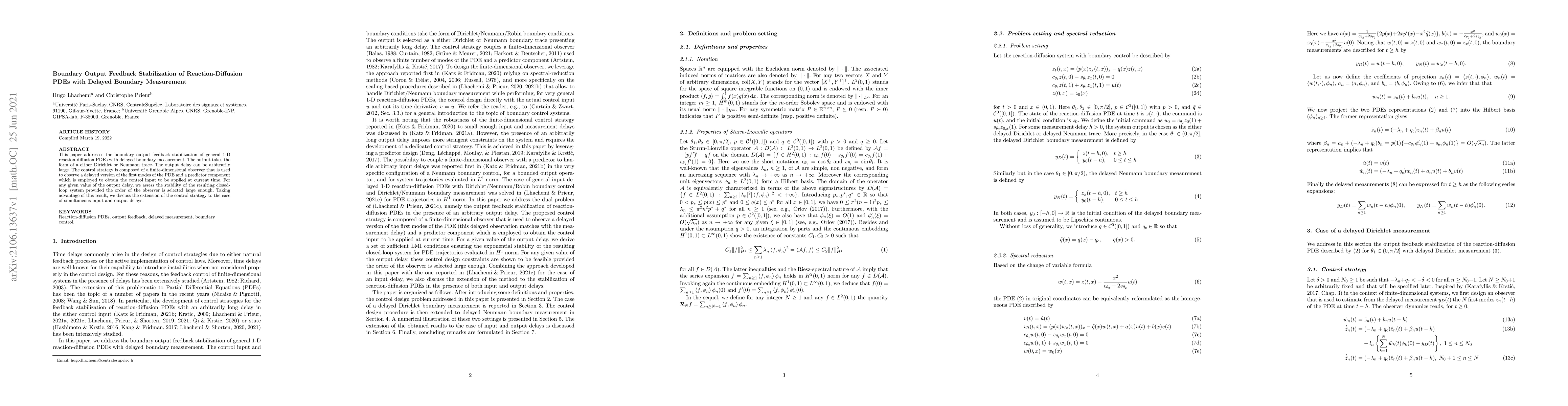 This paper addresses the boundary output feedback stabilization of general 1-D reaction-diffusion PDEs with delayed boundary measurement. The output takes the form of a either Dirichlet or Neumann trace. The output delay can be arbitrarily large. The control strategy is composed of a finite-dimensional observer that is used to observe a delayed version of the first modes of the PDE and a predictor component which is employed to obtain the control input to be applied at current time. For any given value of the output delay, we assess the stability of the resulting closed-loop system provided the order of the observer is selected large enough. Taking advantage of this result, we discuss the extension of the control strategy to the case of simultaneous input and output delays.