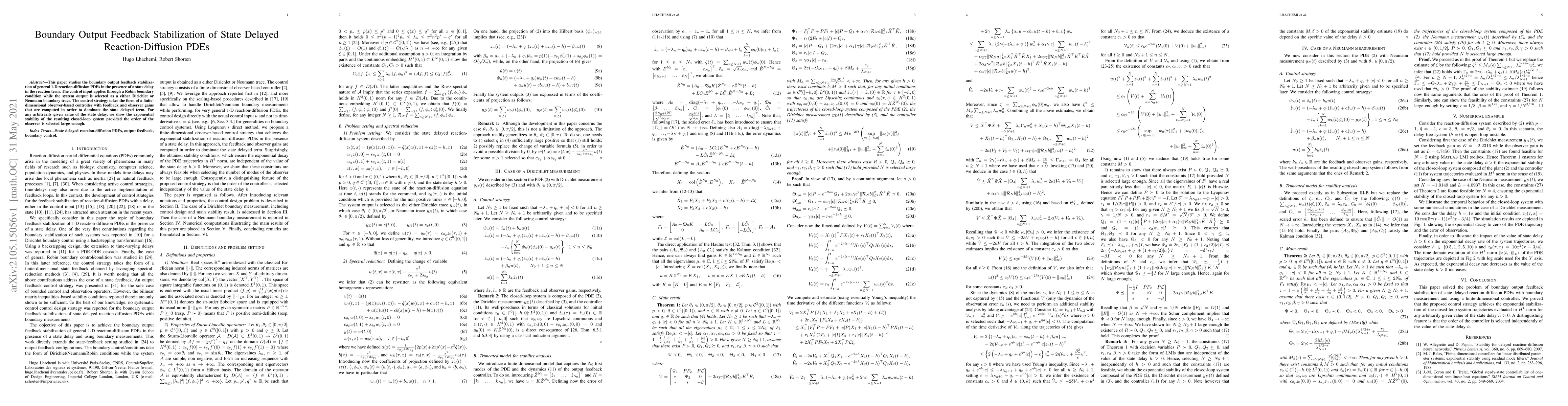 This paper studies the boundary output feedback stabilization of general 1-D reaction-diffusion PDEs in the presence of a state delay in the reaction term. The control input applies through a Robin boundary condition while the system output is selected as a either Dirichlet or Neumann boundary trace. The control strategy takes the form of a finite-dimensional observer-based controller with feedback and observer gains that are computed in order to dominate the state delayed term. For any arbitrarily given value of the state delay, we show the exponential stability of the resulting closed-loop system provided the order of the observer is selected large enough.