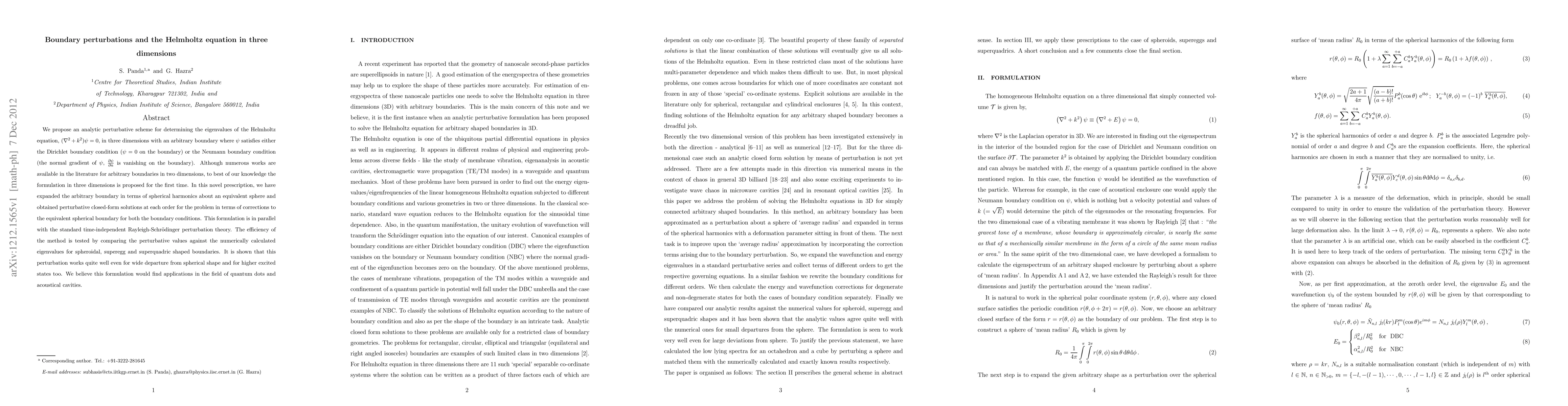 We propose an analytic perturbative scheme for determining the eigenvalues of the Helmholtz equation, $(\nabla^2 + k^2) \psi = 0$, in three dimensions with an arbitrary boundary where $\psi$ satisfies either the Dirichlet boundary condition ($\psi =0$ on the boundary) or the Neumann boundary condition (the normal gradient of $\psi$, $\frac{\partial \psi}{\partial n}$ is vanishing on the boundary). Although numerous works are available in the literature for arbitrary boundaries in two dimensions, to best of our knowledge the formulation in three dimensions is proposed for the first time. In this novel prescription, we have expanded the arbitrary boundary in terms of spherical harmonics about an equivalent sphere and obtained perturbative closed-form solutions at each order for the problem in terms of corrections to the equivalent spherical boundary for both the boundary conditions. This formulation is in parallel with the standard time-independent Rayleigh-Schr{\"o}dinger perturbation theory. The efficiency of the method is tested by comparing the perturbative values against the numerically calculated eigenvalues for spheroidal, superegg and superquadric shaped boundaries. It is shown that this perturbation works quite well even for wide departure from spherical shape and for higher excited states too. We believe this formulation would find applications in the field of quantum dots and acoustical cavities.