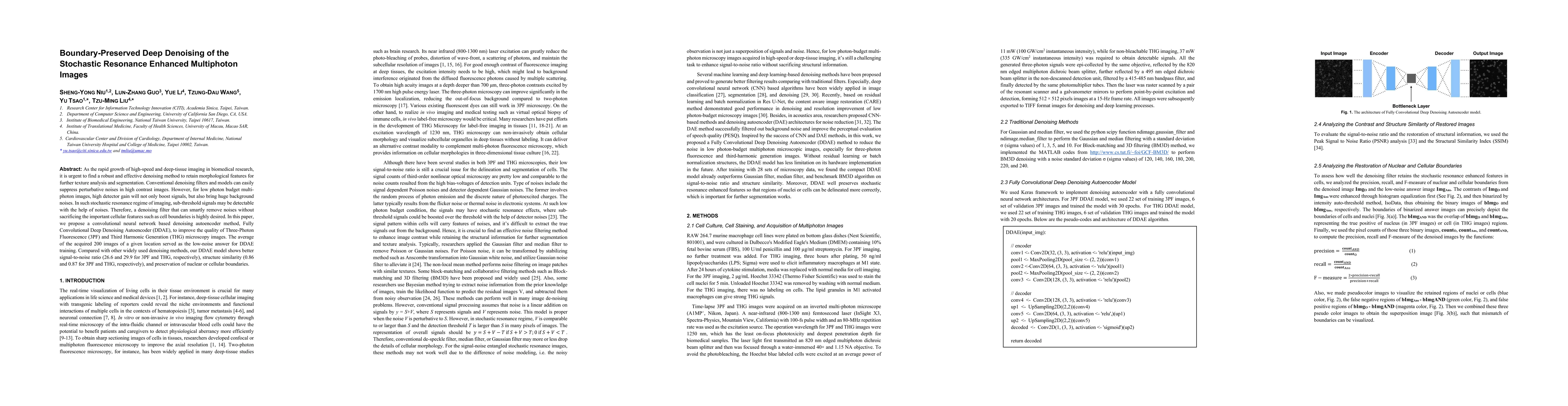 As the rapid growth of high-speed and deep-tissue imaging in biomedical research, it is urgent to find a robust and effective denoising method to retain morphological features for further texture analysis and segmentation. Conventional denoising filters and models can easily suppress perturbative noises in high contrast images. However, for low photon budget multi-photon images, high detector gain will not only boost signals, but also bring huge background noises. In such stochastic resonance regime of imaging, sub-threshold signals may be detectable with the help of noises. Therefore, a denoising filter that can smartly remove noises without sacrificing the important cellular features such as cell boundaries is highly desired. In this paper, we propose a convolutional neural network based autoencoder method, Fully Convolutional Deep Denoising Autoencoder (DDAE), to improve the quality of Three-Photon Fluorescence (3PF) and Third Harmonic Generation (THG) microscopy images. The average of the acquired 200 images of a given location served as the low-noise answer for DDAE training. Compared with other widely used denoising methods, our DDAE model shows better signal-to-noise ratio (26.6 and 29.9 for 3PF and THG, respectively), structure similarity (0.86 and 0.87 for 3PF and THG, respectively), and preservation of nuclear or cellular boundaries.