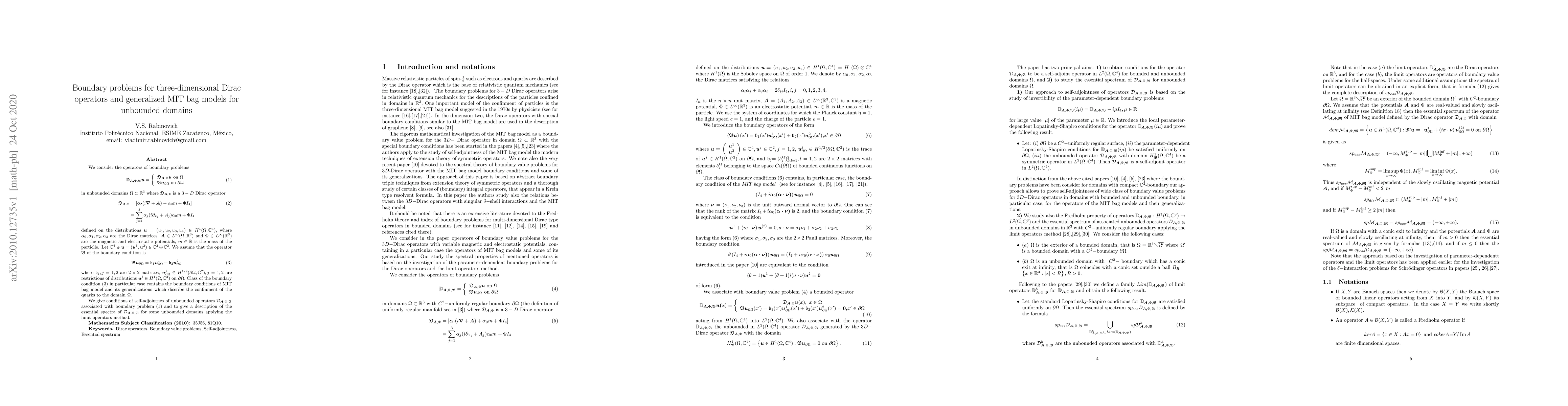 Summary: This paper explores boundary value problems for three-dimensional Dirac operators in unbounded domains, providing conditions for self-adjointness and describing their essential spectra, and applies these findings to generalized MIT bag models in such domains.
