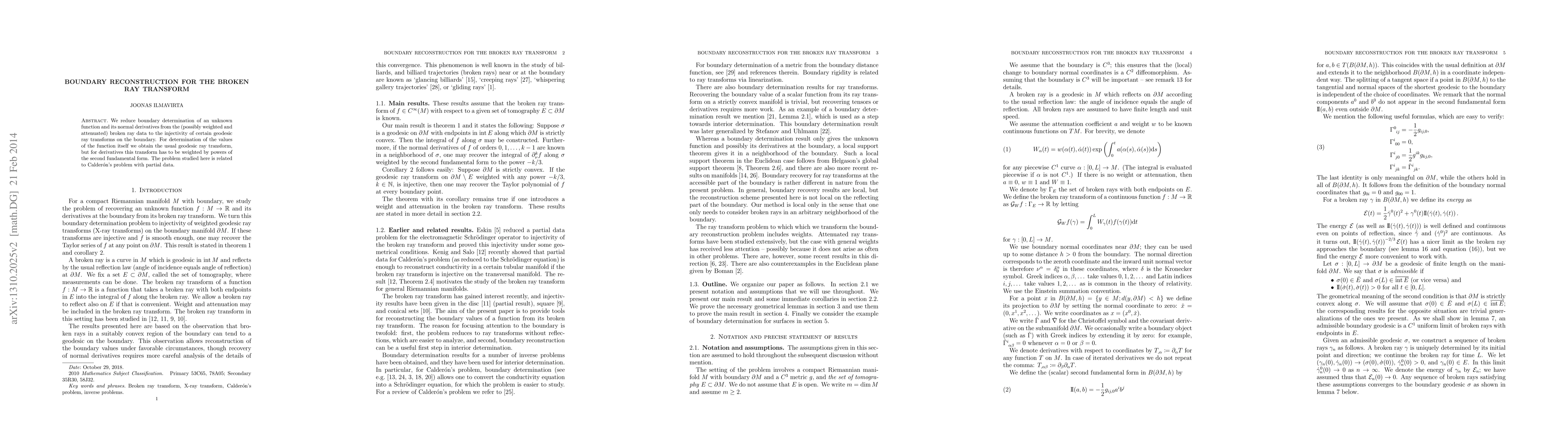 This paper addresses boundary reconstruction using the broken ray transform, linking it to geodesic ray transforms on the boundary, and introduces weighted transforms for normal derivatives related to Calder\'on's problem with partial data.
