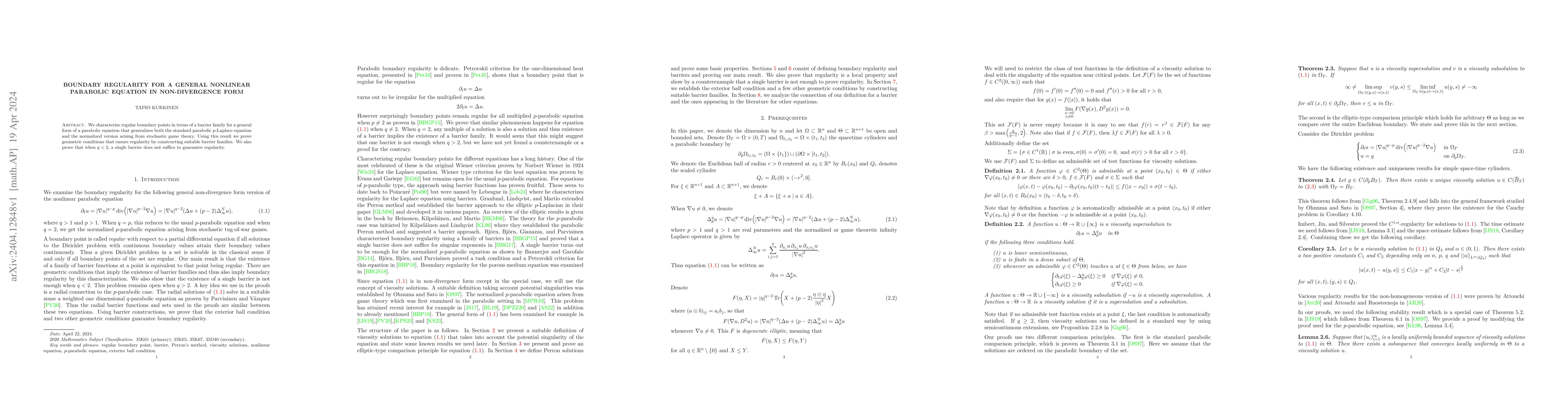 This paper characterizes regular boundary points for a general nonlinear parabolic equation in non-divergence form through the use of barrier families, proving geometric conditions that ensure boundary regularity and noting that for $q<2$, a single barrier is insufficient for regularity.