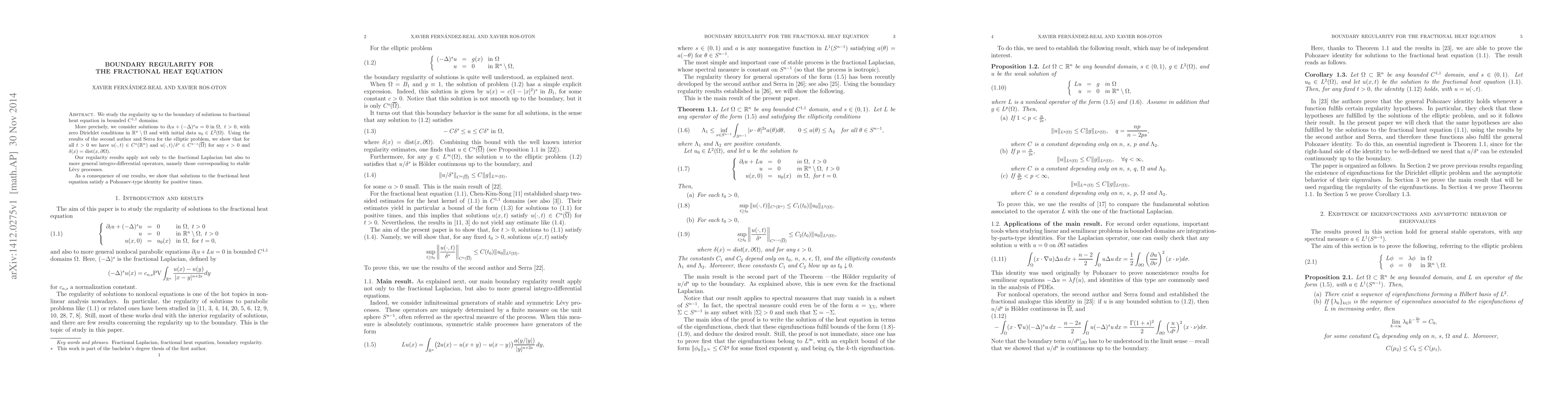 This paper explores the boundary regularity of solutions to the fractional heat equation in $C^{1,1}$ domains, proving that solutions are Hölder continuous up to the boundary. The results extend to general integro-differential operators linked to stable Lévy processes and imply a Pohozaev-type identity for positive times.