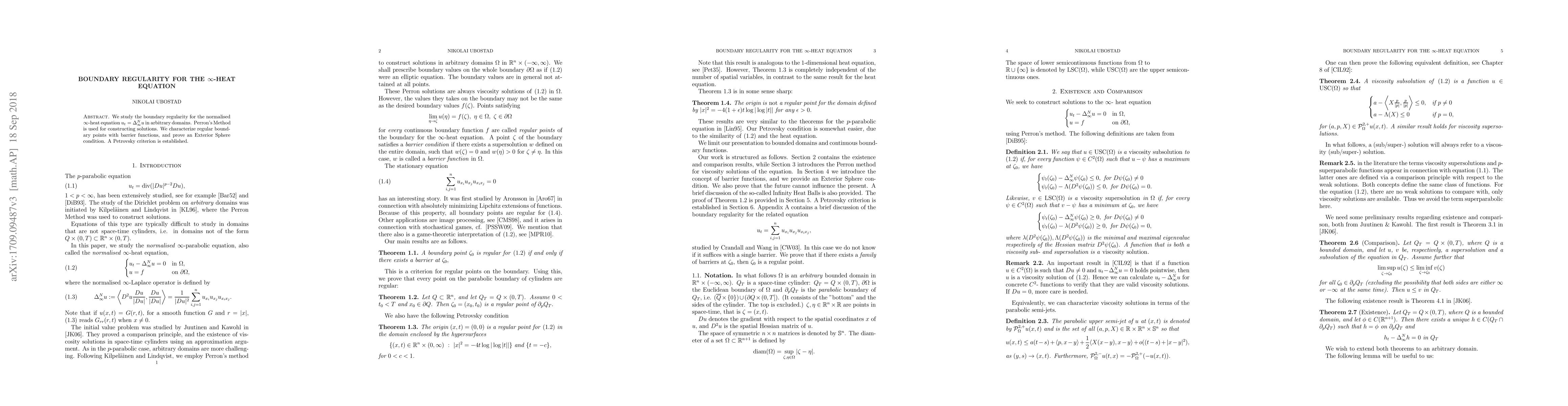 This paper studies boundary regularity for the infinity-heat equation in arbitrary domains using Perron's Method, establishing a Petrovsky-like criterion and proving an Exterior Ball result to characterize regular boundary points with barrier functions.