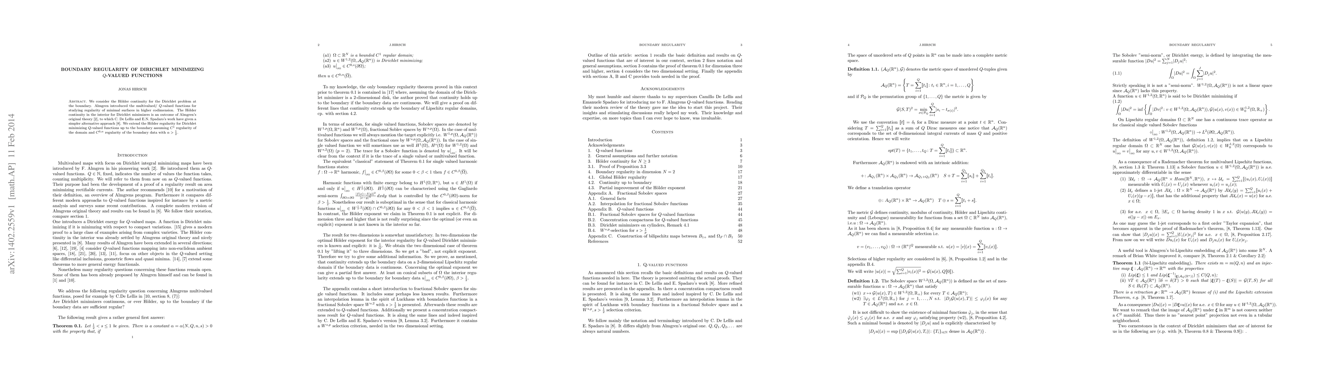 This paper explores the H\"older continuity of Dirichlet minimizing Q-valued functions up to the boundary, extending previous results that only covered the interior. It assumes sufficient regularity of the domain and boundary data with an exponent greater than 1/2.