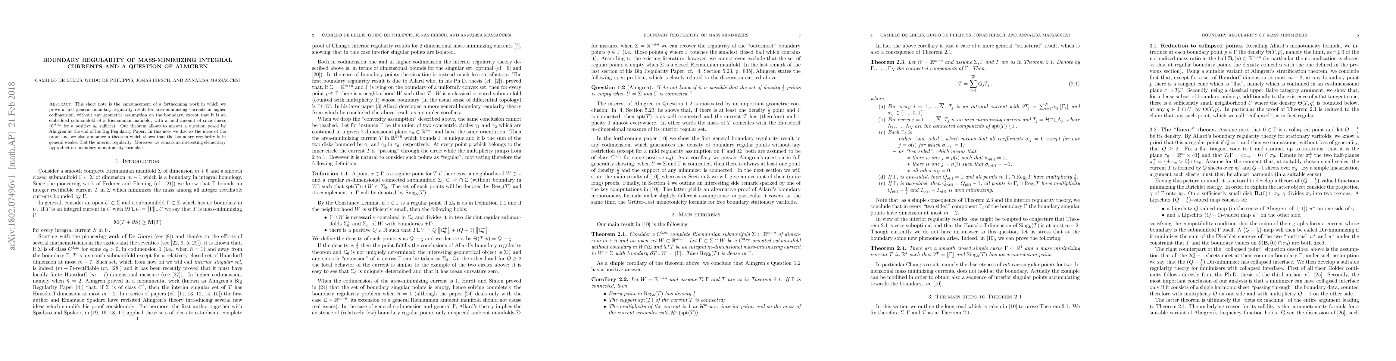 This short note is the announcement of a forthcoming work in which we prove a first general boundary regularity result for area-minimizing currents in higher codimension, without any geometric assumption on the boundary, except that it is an embedded submanifold of a Riemannian manifold, with a mild amount of smoothness ($C^{3, a_0}$ for a positive $a_0$ suffices). Our theorem allows to answer a question posed by Almgren at the end of his Big Regularity Paper. In this note we discuss the ideas of the proof and we also announce a theorem which shows that the boundary regularity is in general weaker that the interior regularity. Moreover we remark an interesting elementary byproduct on boundary monotonicity formulae.