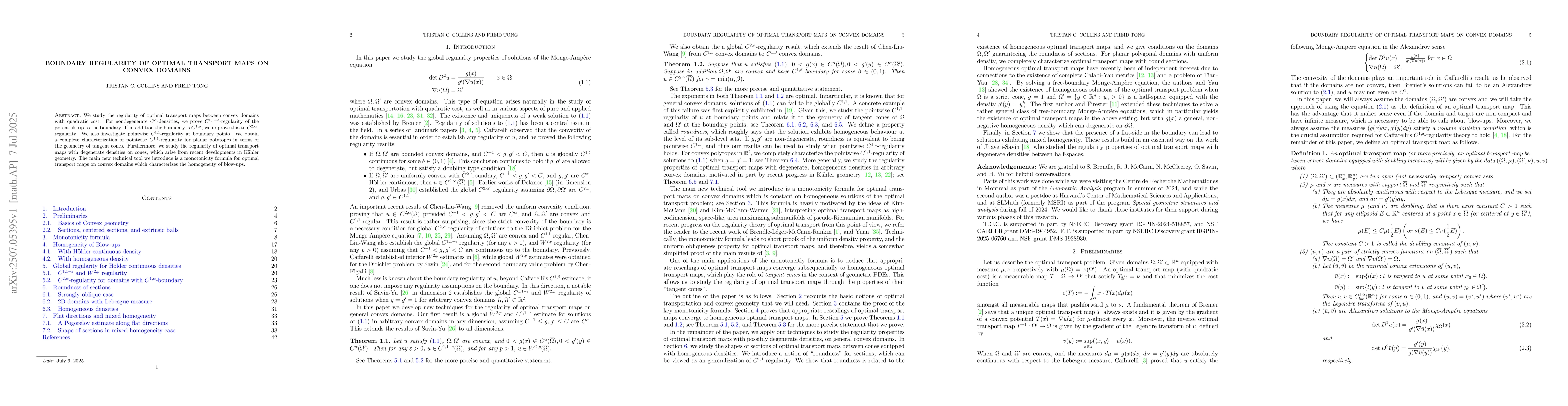 We study the regularity of optimal transport maps between convex domains with quadratic cost. For nondegenerate $C^{\alpha}$-densities, we prove $C^{1, 1-\varepsilon}$-regularity of the potentials up to the boundary. If in addition the boundary is $C^{1, \alpha}$, we improve this to $C^{2, \alpha}$-regularity. We also investigate pointwise $C^{1, 1}$-regularity at boundary points. We obtain a complete characterization of pointwise $C^{1, 1}$-regularity for planar polytopes in terms of the geometry of tangent cones. Furthermore, we study the regularity of optimal transport maps with degenerate densities on cones, which arise from recent developments in K\"ahler geometry. The main new technical tool we introduce is a monotonicity formula for optimal transport maps on convex domains which characterizes the homogeneity of blow-ups.