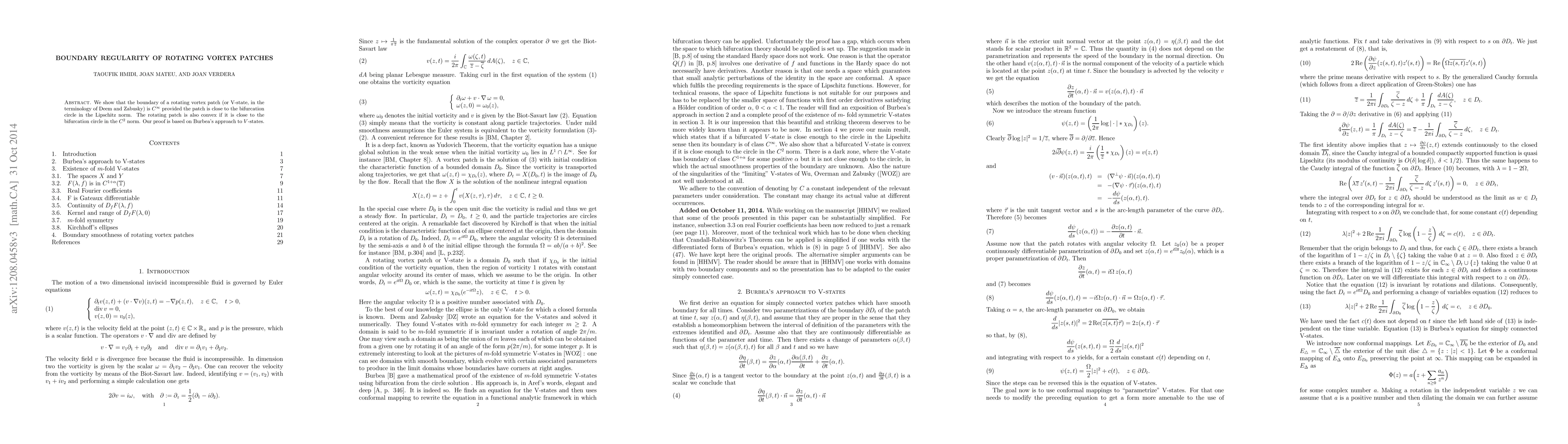 We show that the boundary of a rotating vortex patch (or V-state, in the terminology of Deem and Zabusky) is of class C^infinity provided the patch is close enough to the bifurcation circle in the Lipschitz norm. The rotating patch is convex if it is close enough to the bifurcation circle in the C^2 norm. Our proof is based on Burbea's approach to V-states. Thus conformal mapping plays a relevant role as well as estimating, on H\"older spaces, certain non-convolution singular integral operators of Calder\'on-Zygmund type.