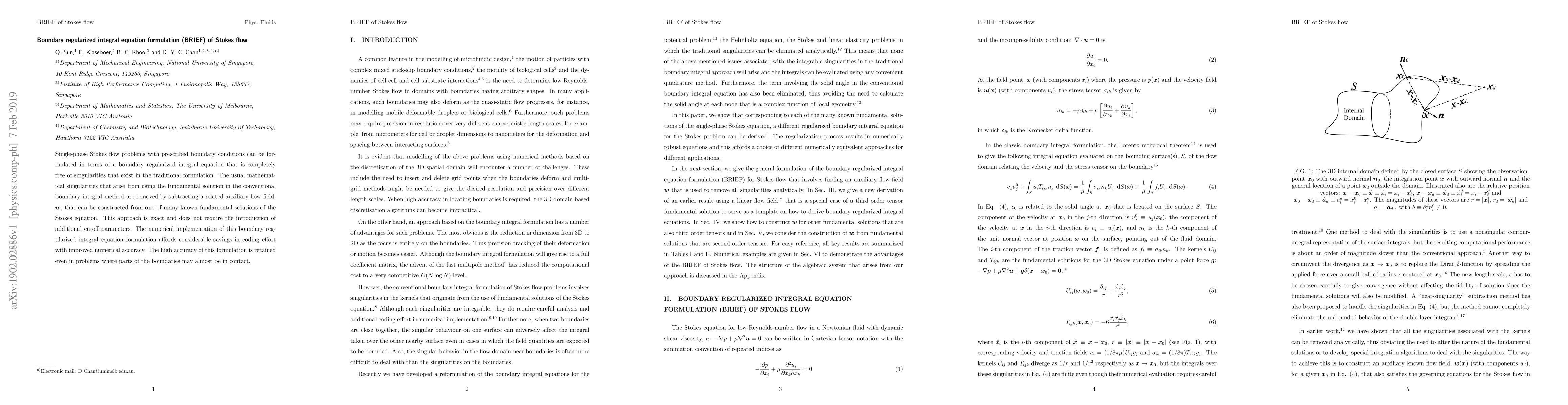 The paper proposes a boundary regularized integral equation formulation (BRIEF) for Stokes flow, eliminating singularities found in traditional methods by subtracting an auxiliary flow field. This approach enhances numerical accuracy and simplifies coding, maintaining high precision even in near-contact boundary conditions.