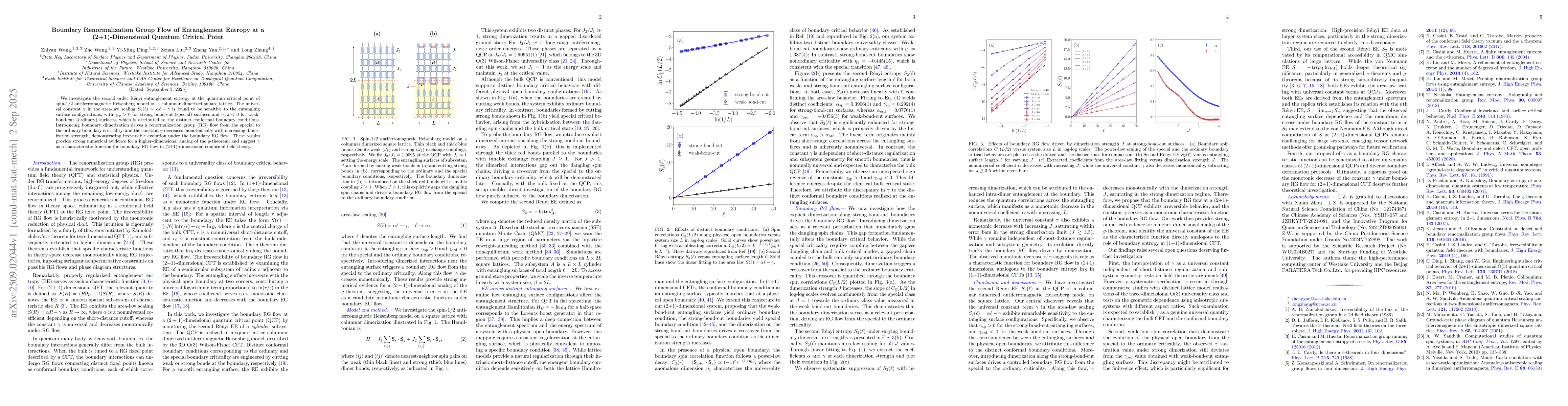 We investigate the second order R\'enyi entanglement entropy at the quantum critical point of spin-1/2 antiferromagnetic Heisenberg model on a columnar dimerized square lattice. The universal constant $\gamma$ in the area-law scaling $S_{2}(\ell) = \alpha\ell - \gamma$ is found to be sensitive to the entangling surface configurations, with $\gamma_{\text{sp}} > 0$ for strong-bond-cut (special) surfaces and $\gamma_{\text{ord}} < 0$ for weak-bond-cut (ordinary) surfaces, which is attributed to the distinct conformal boundary conditions. Introducing boundary dimerization drives a renormalization group (RG) flow from the special to the ordinary boundary criticality, and the constant $\gamma$ decreases monotonically with increasing dimerization strength, demonstrating irreversible evolution under the boundary RG flow. These results provide strong numerical evidence for a higher-dimensional analog of the $g$-theorem, and suggest $\gamma$ as a characteristic function for boundary RG flow in (2+1)-dimensional conformal field theory.