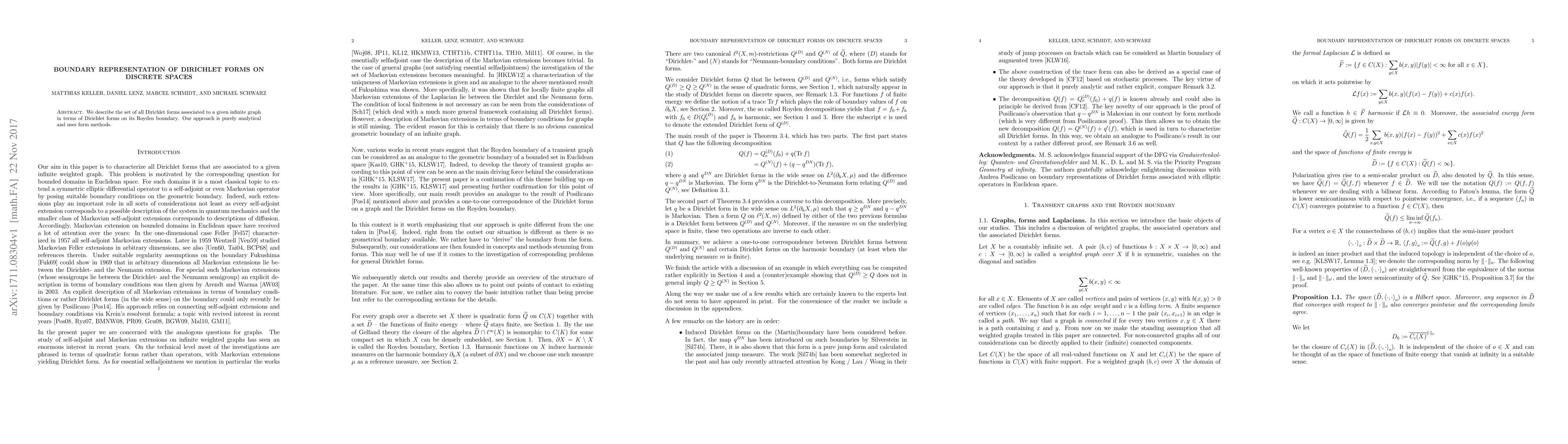 We describe the set of all Dirichlet forms associated to a given infinite graph in terms of Dirichlet forms on its Royden boundary. Our approach is purely analytical and uses form methods.