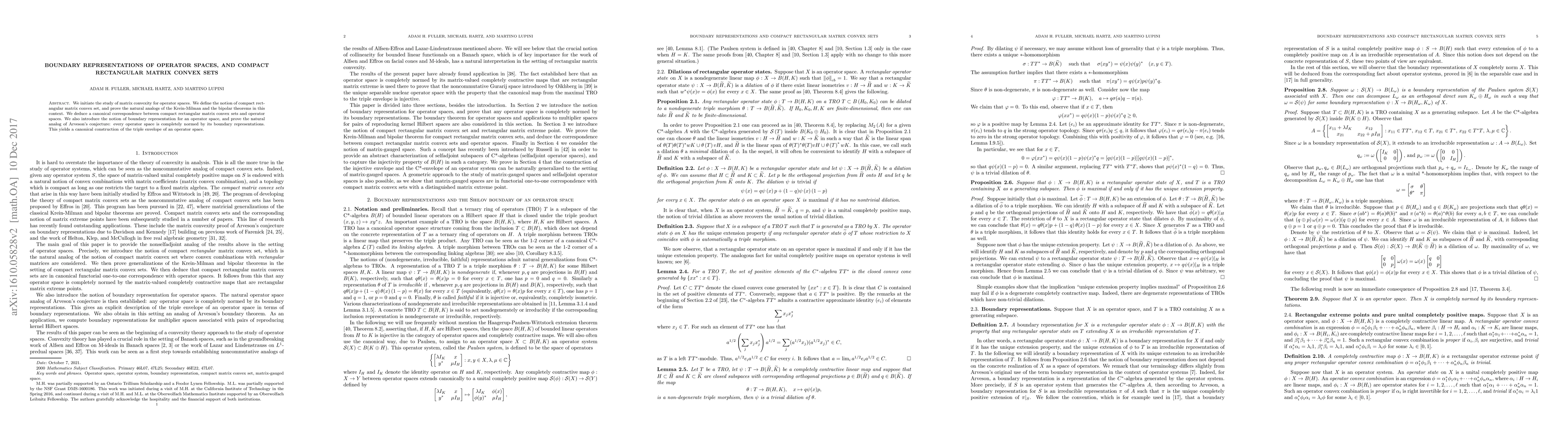 This paper explores matrix convexity in operator spaces, defining compact rectangular matrix convex sets and proving analogs of the Krein-Milman and bipolar theorems. It establishes a correspondence between these sets and operator spaces, introduces boundary representations, and verifies Arveson's conjecture, leading to a canonical triple envelope construction.