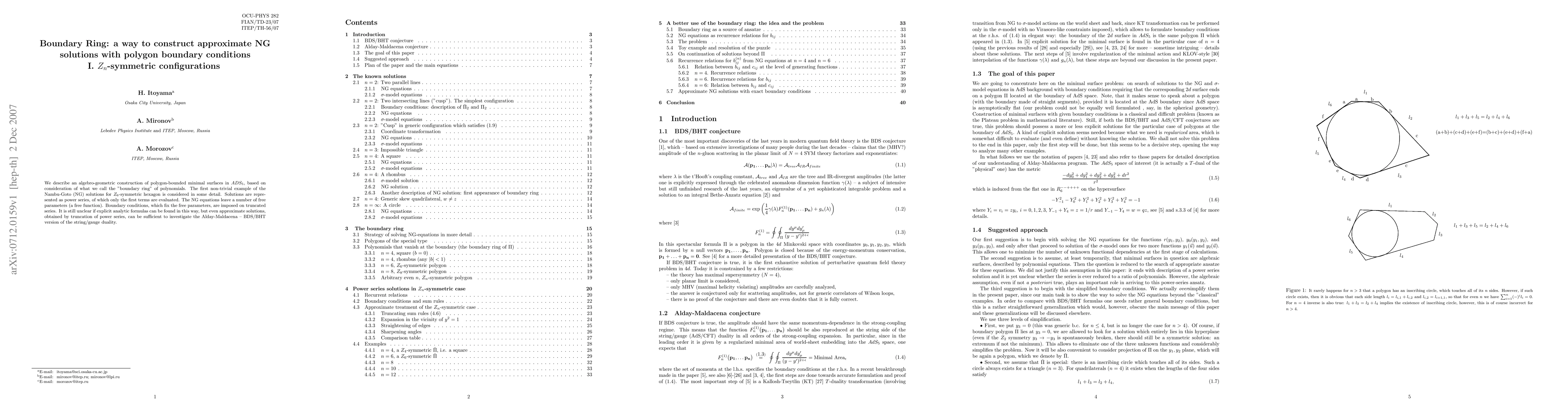 We describe an algebro-geometric construction of polygon-bounded minimal surfaces in ADS_5, based on consideration of what we call the "boundary ring" of polynomials. The first non-trivial example of the Nambu-Goto (NG) solutions for Z_6-symmetric hexagon is considered in some detail. Solutions are represented as power series, of which only the first terms are evaluated. The NG equations leave a number of free parameters (a free function). Boundary conditions, which fix the free parameters, are imposed on truncated series. It is still unclear if explicit analytic formulas can be found in this way, but even approximate solutions, obtained by truncation of power series, can be sufficient to investigate the Alday-Maldacena -- BDS/BHT version of the string/gauge duality.
