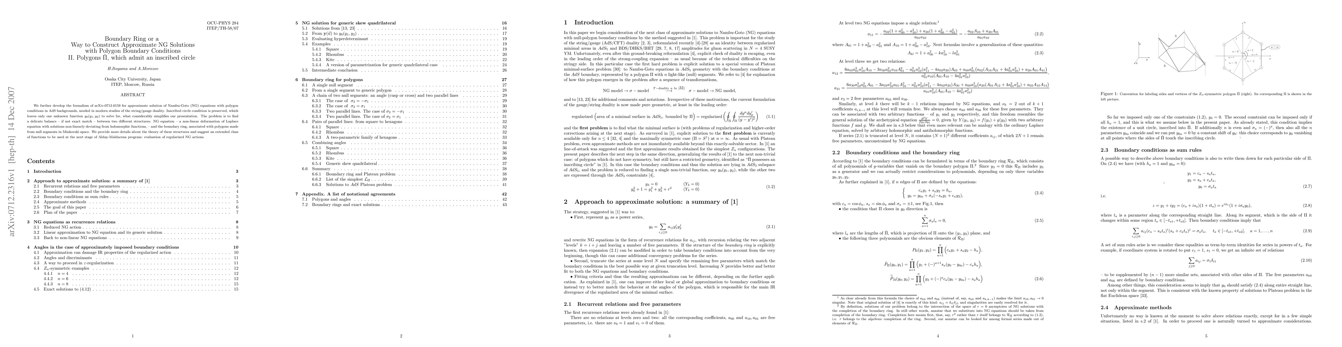 We further develop the formalism of arXiv:0712.0159 for approximate solution of Nambu-Goto (NG) equations with polygon conditions in AdS backgrounds, needed in modern studies of the string/gauge duality. Inscribed circle condition is preserved, which leaves only one unknown function y_0(y_1,y_2) to solve for, what considerably simplifies our presentation. The problem is to find a delicate balance -- if not exact match -- between two different structures: NG equation -- a non-linear deformation of Laplace equation with solutions non-linearly deviating from holomorphic functions, -- and the boundary ring, associated with polygons made from null segments in Minkovski space. We provide more details about the theory of these structures and suggest an extended class of functions to be used at the next stage of Alday-Maldacena program: evaluation of regularized NG actions.