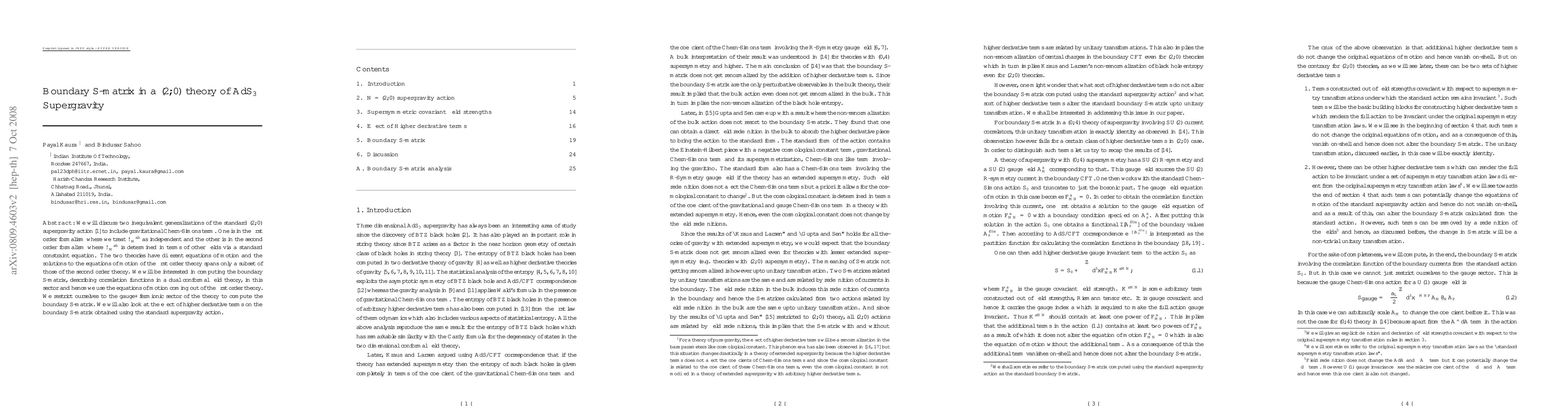 We will discuss two inequivalent generalizations of the standard (2,0) supergravity action gr-qc/9501018 to include gravitational Chern-Simons term. One is in the first order formalism where we treat \omega_{M}^{ab} as independent and the other is in the second order formalism where \omega_{M}^{ab} is determined in terms of other fields via a standard constraint equation. The two theories have different equations of motion and the solutions to the equations of motion of the first order theory spans only a subset of those of the second order theory. We will be interested in computing the boundary S-matrix, describing correlation functions in a dual conformal field theory, in this sector and hence we use the equations of motion coming out of the first order theory. We restrict ourselves to the gauge+fermionic sector of the theory to compute the boundary S-matrix. We will also look at the effect of higher derivative terms on the boundary S-matrix obtained using the standard supergravity action.
